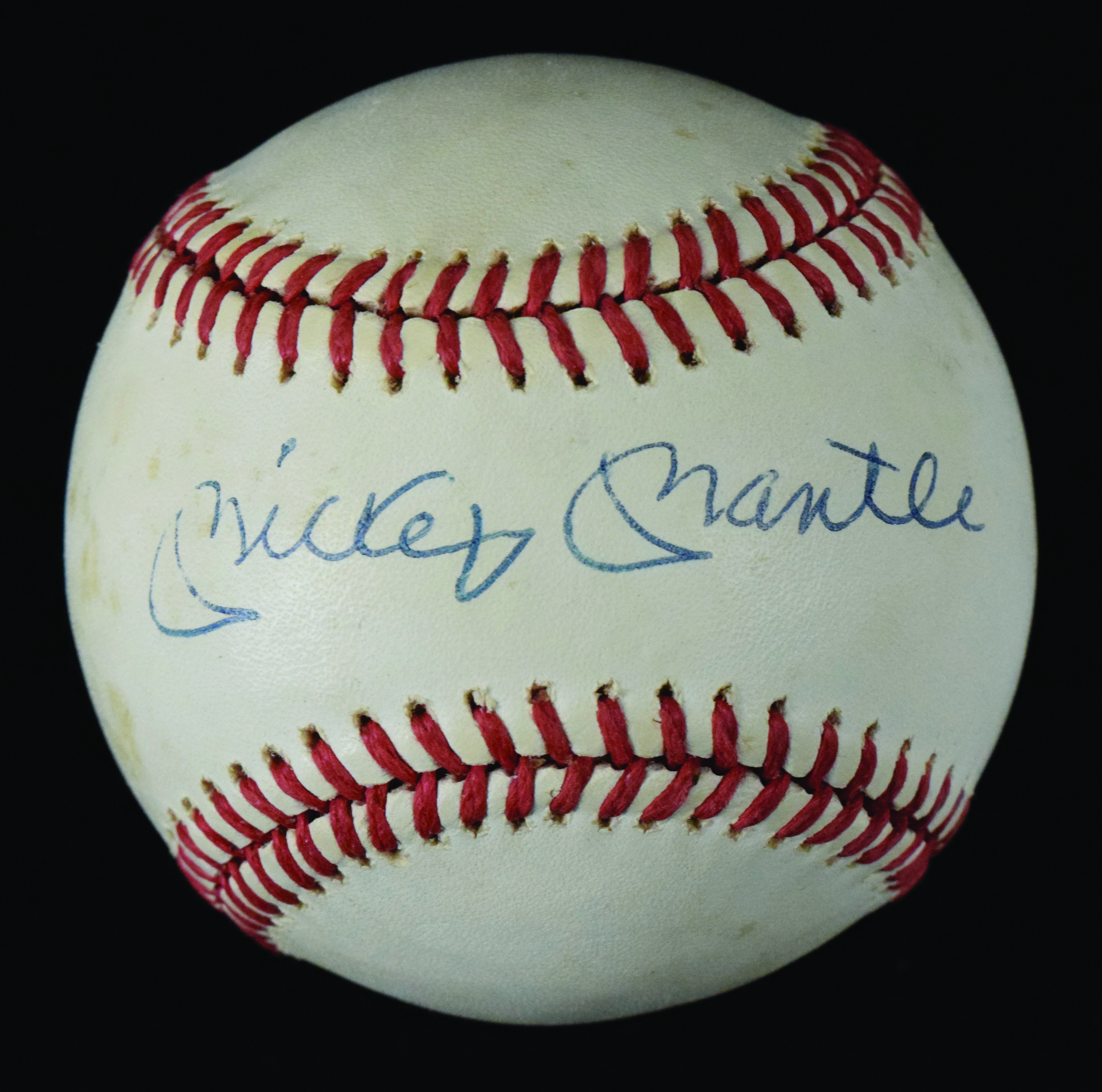 Description:Mickey Mantle signed B.Brown AL baseball - JSA (EX). Mantle signed the sweet spot in blue ink. Signature rates 8 out of 10. Includes LOA from JSA, with matching serial #ed sticker on the ball. Areas of light to moderate toning on each panel: EX