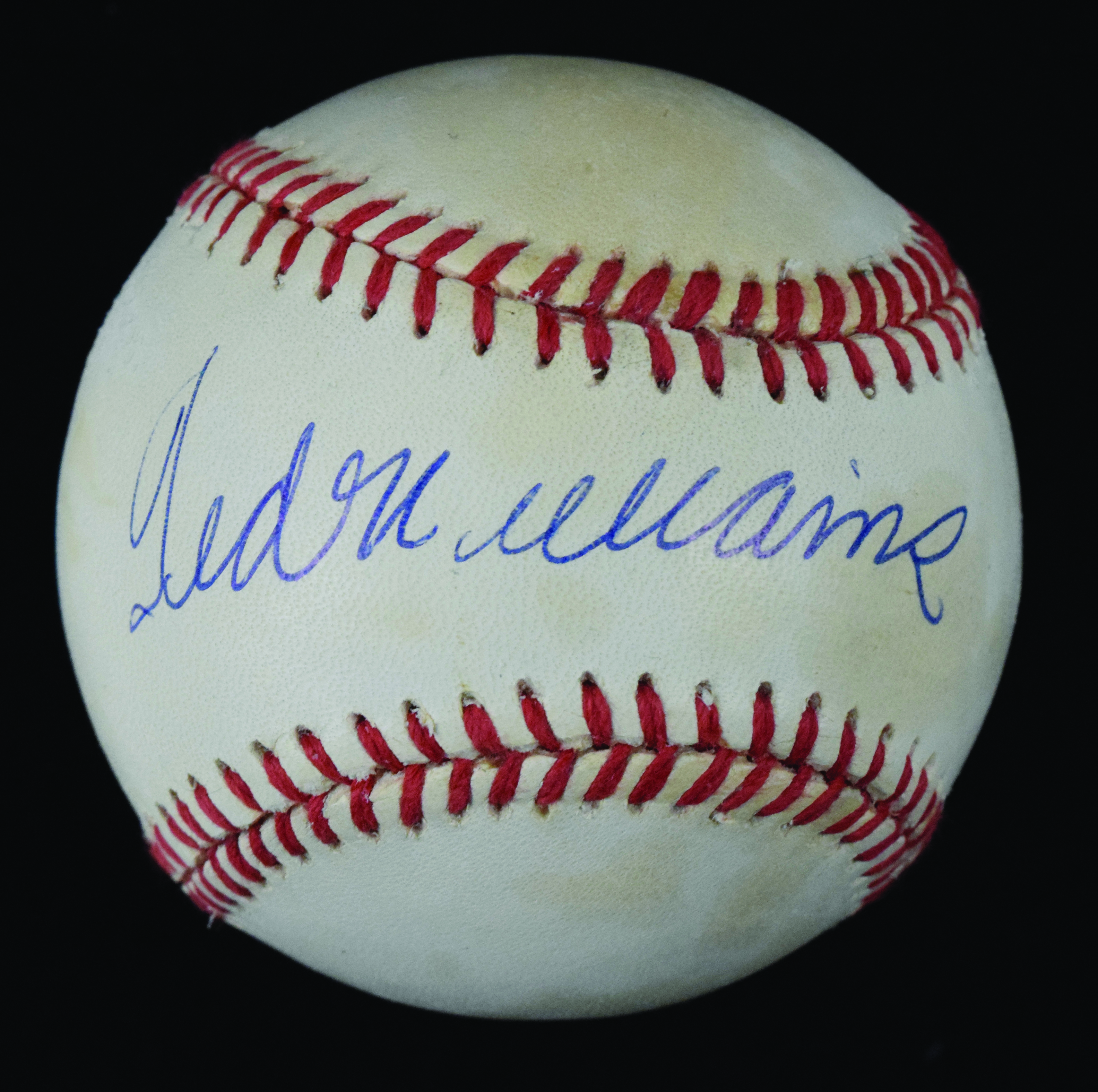 Description:Ted Williams signed B.Brown AL baseball - UDA (EX). Williams signed the sweet spot in blue ink. Signature rates 8/9 out of 10. Upper Deck Authenticated serial #ed hologram sticker is on the ball. Areas of light to moderate toning on each panel: EX