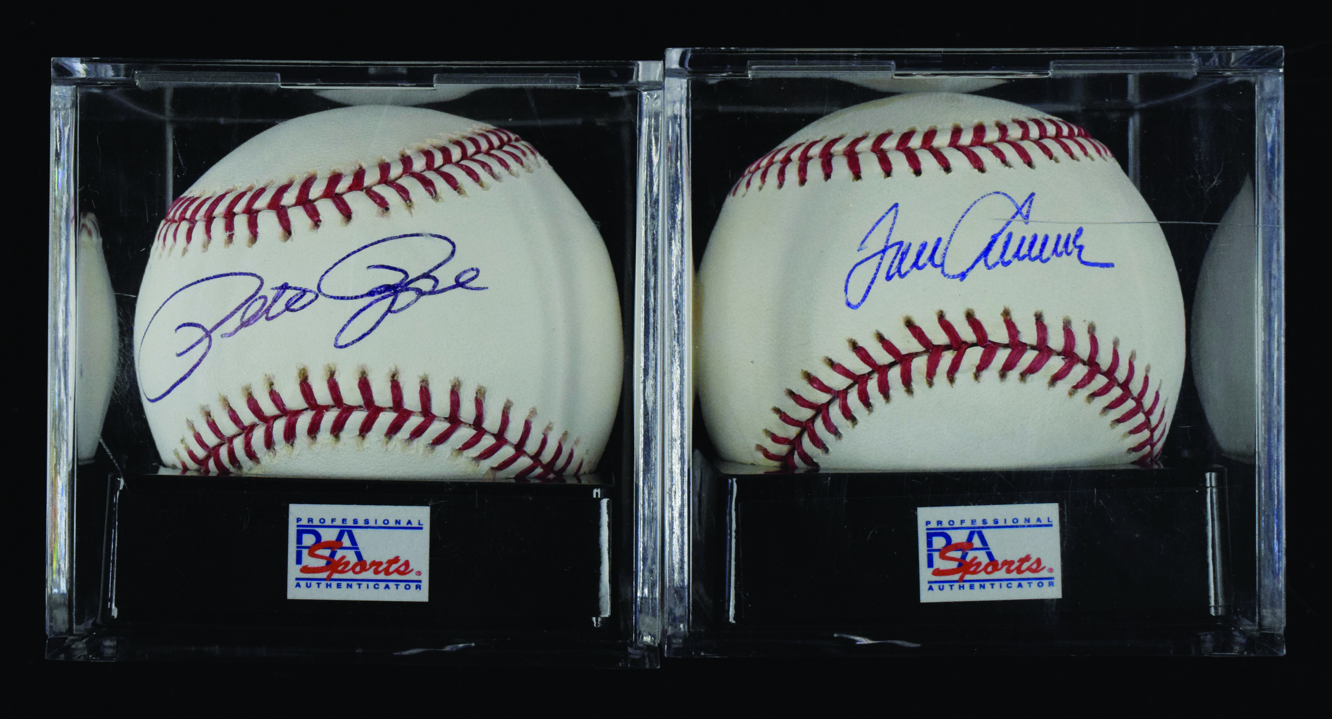 Description:PSA graded Tom Seaver and Pete Rose signed baseballs (MT). Includes B.Selig ML ball signed by Tom Seaver (auto grade 10, ball grade 9, overall grade 9.5); and B.Selig ML ball signed by Pete Rose (auto grade 9, ball grade 9, overall grade 9). Both come with COA from PSA/DNA, with matching serial #ed sticker on the ball: MT
