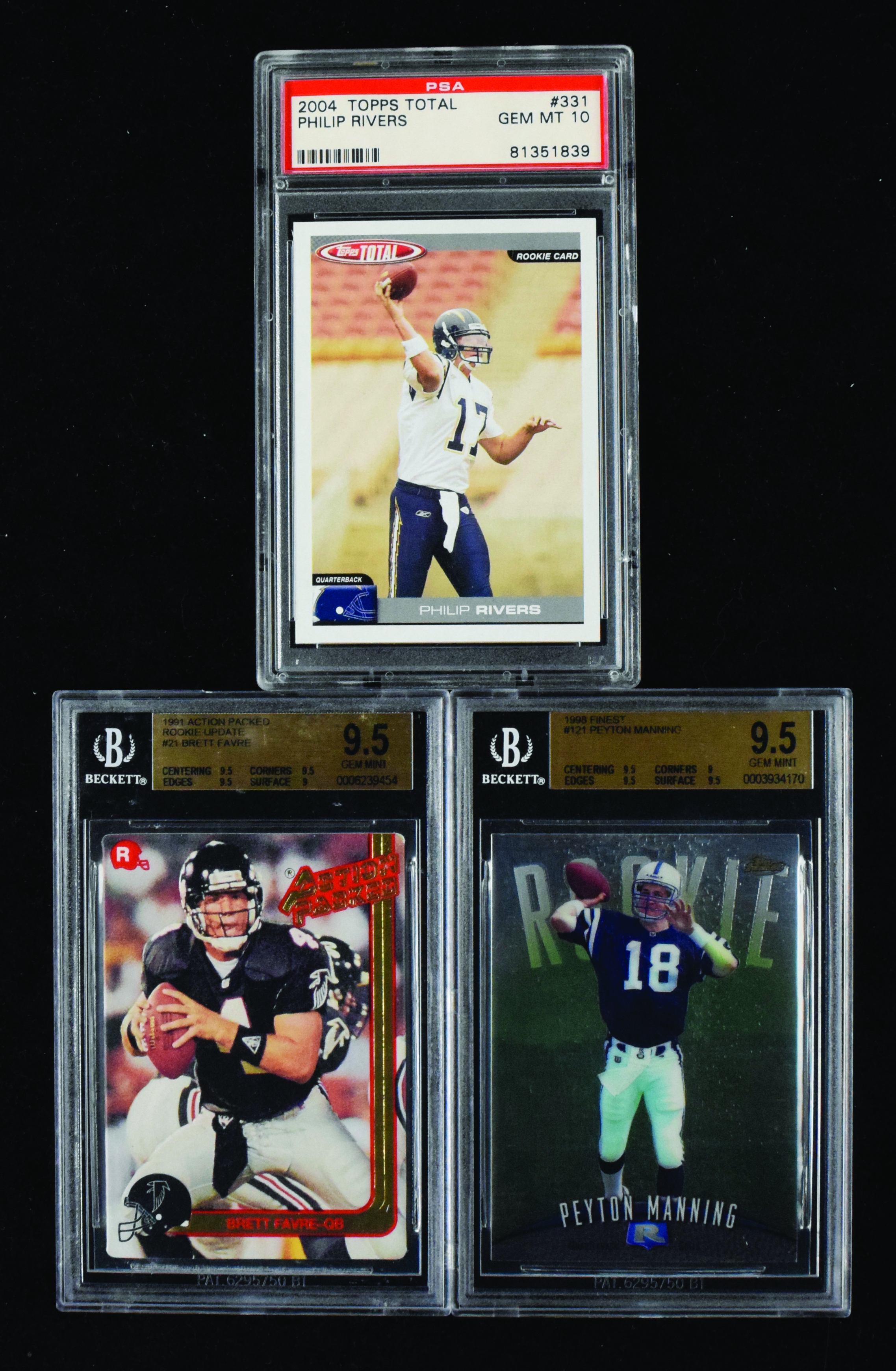 Description: Philip Rivers, Brett Favre, and Peyton Manning graded rookie cards (GEM MINT). Includes 1991 Action Packed Rookie Update #21 Favre (Beckett 9.5 GEM MINT), 1998 Topps Finest #121 Manning (Beckett 9.5 GEM MINT), and 2004 Topps Total #331 Rivers (PSA 10 GEM MINT).
