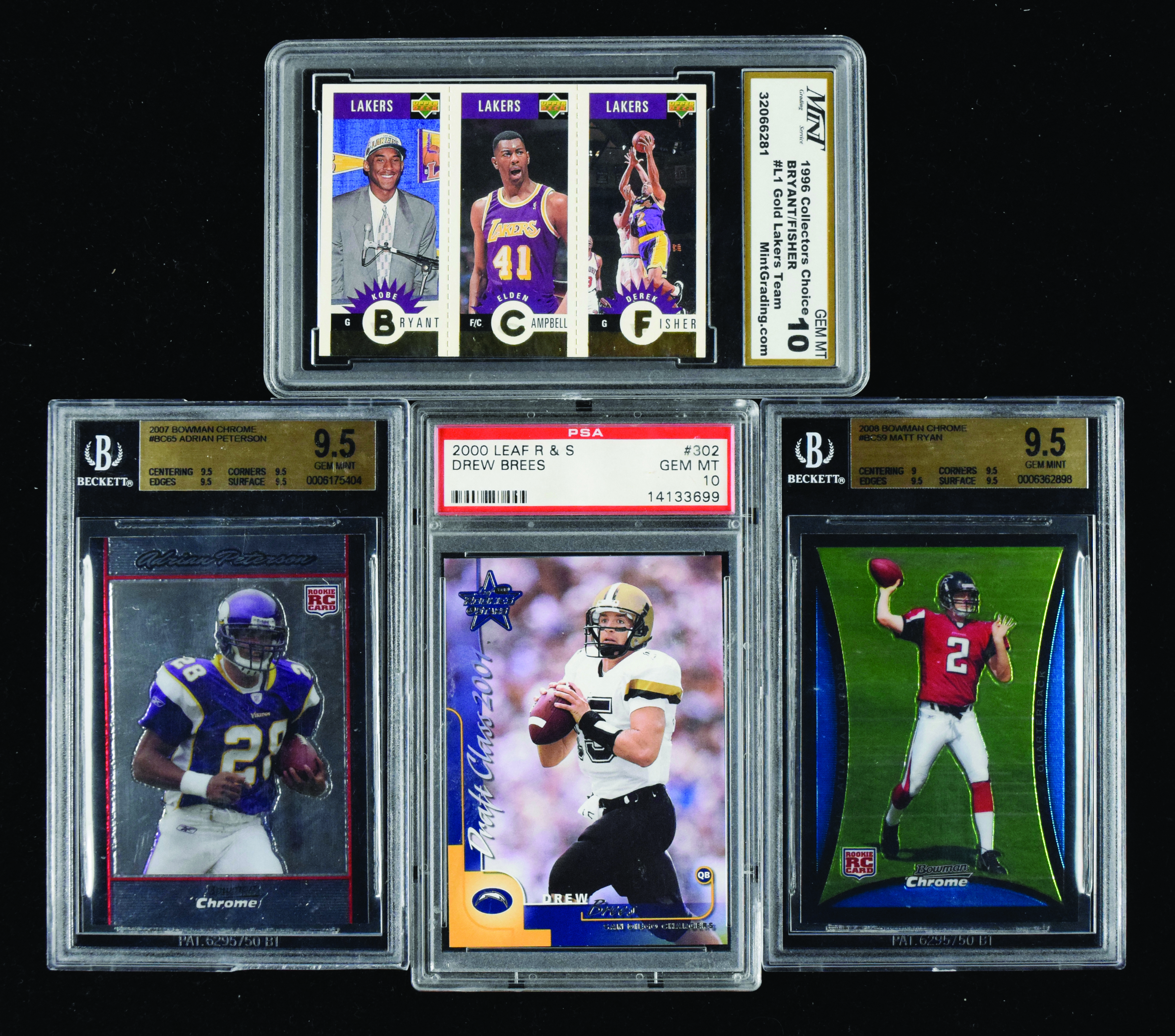 Description:Drew Brees, Kobe Bryant, Matt Ryan, Adrian Peterson rookie cards (NM - GEM MINT). Includes 1996-97 Upper Deck Collector's Choice "Los Angeles Lakers" #L1 Bryant/Fisher/Campbell (NM), 2000 Leaf Rookies & Stars #302 Brees (PSA 10 GEM MINT), 2007 Bowman Chrome #BC65 Peterson (Beckett 9.5 GEM MINT), and 2008 Bowman Chrome #BC59 Ryan (Beckett 9.5 GEM MINT).