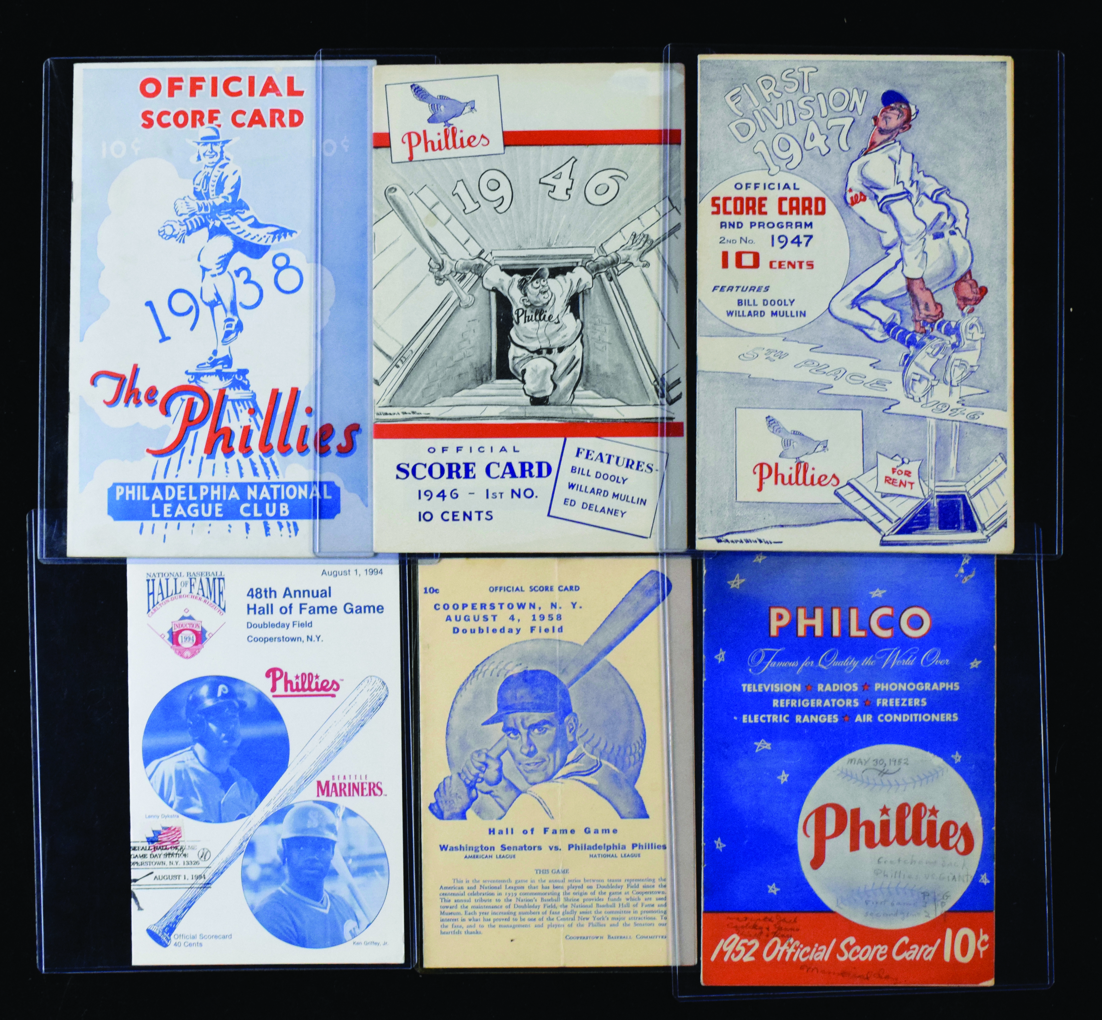 Description:Lot of (8) Philadelphia Phillies programs/scorecards from 1938-2003 (VG-NM). Includes 8/16/1938 vs Boston Bees (scored), 6/16/1946 second game of doubleheader vs Pittsburgh Pirates (scored), 8/21/1947 first game of doubleheader vs St. Louis Cardinals (scored), 5/30/1952 first game of doubleheader vs New York Giants (scored), 8/4/1958 HOF Game vs Washington Senators (unscored), 8/8/1977 HOF Game vs Minnesota Twins with ticket stub (scored, ticket stub has tape residue), 8/1/1994 HOF Game vs Seattle Mariners (unscored), and 6/16/2003 HOF Game vs Tampa Bay Devil Rays (unscored). Most appear to average EX overall. Range: VG-NM