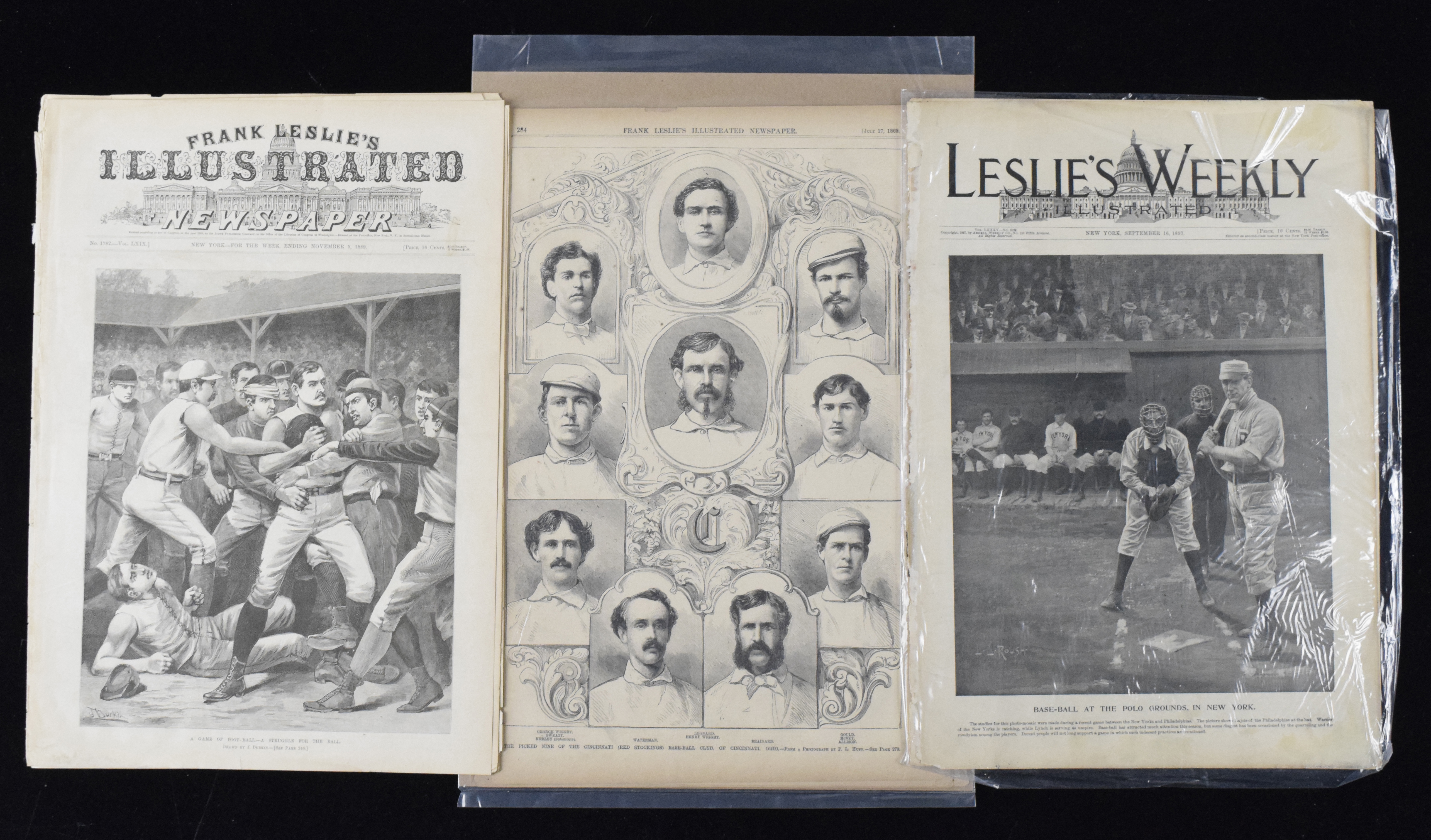 Description:Lot of Frank Leslie's Illustrated woodcuts from 1865-1897 (VG-VG/EX). Includes 8/26/1865 "Base Ball Match For The Championship Between The Atlantic Club Of Brooklyn And The Mutual Club Of New York" (b&w and colorized versions); 7/17/1869 "The Picked Nine Of The Cincinnati Red Stockings Base-Ball Club" including George Wright and Harry Wright; 7/10/1886 "Portraits Of The Manager And Members Of The New York Baseball Club" including Tim Keefe, Mickey Welch, Jim O'Rourke, Buck Ewing, Roger Connor, and John Ward; 11/9/1889 cover page picturing "A Game Of Foot-Ball"; and 9/16/1897 cover page picturing Nap Lajoie: VG-VG/EX