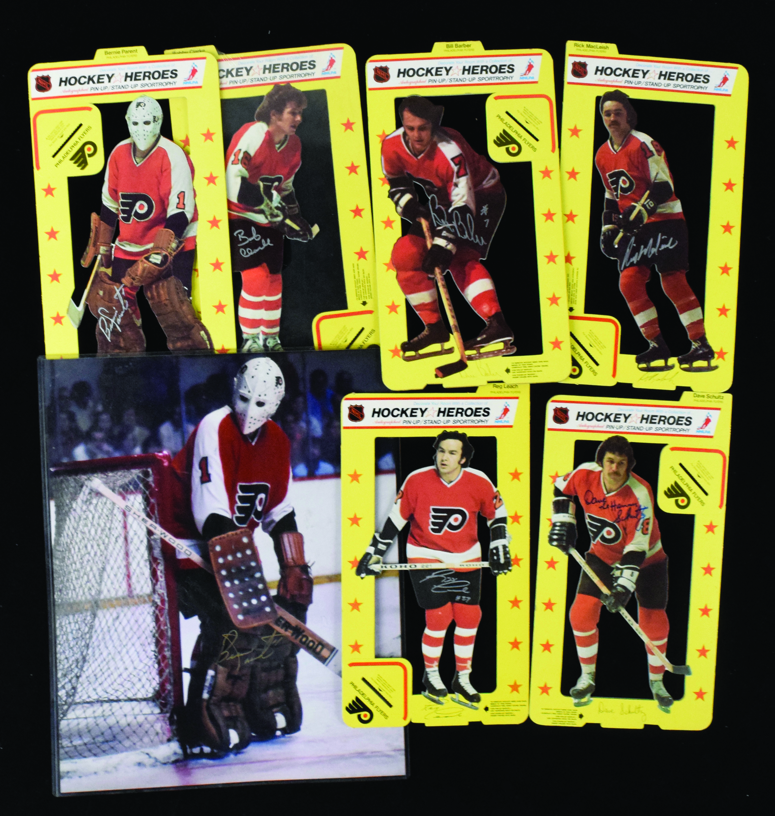 Description:Philadelphia Flyers autograph lot with stars and HOFers (EX-NM). Includes 16"x20" photo signed by Bernie Parent; 25.5" mini hockey stick signed by Bernie Parent; (6) signed 1975 Hockey Heroes 8.75"x16" stand-ups: Bernie Parent, Bobby Clarke, Bill Barber, Rick MacLeish, Reggie Leach, and Dave "The Hammer" Schultz; (7) signed 8"x10" photos: Bernie Parent, Bob Clarke, Rick MacLeish, Reggie "The Rifle" Leach, (2) different Dave "The Hammer" Schultz, and Andre Dupont. Signatures rate 7 to 10 (avg 8/9) out of 10: EX-NM