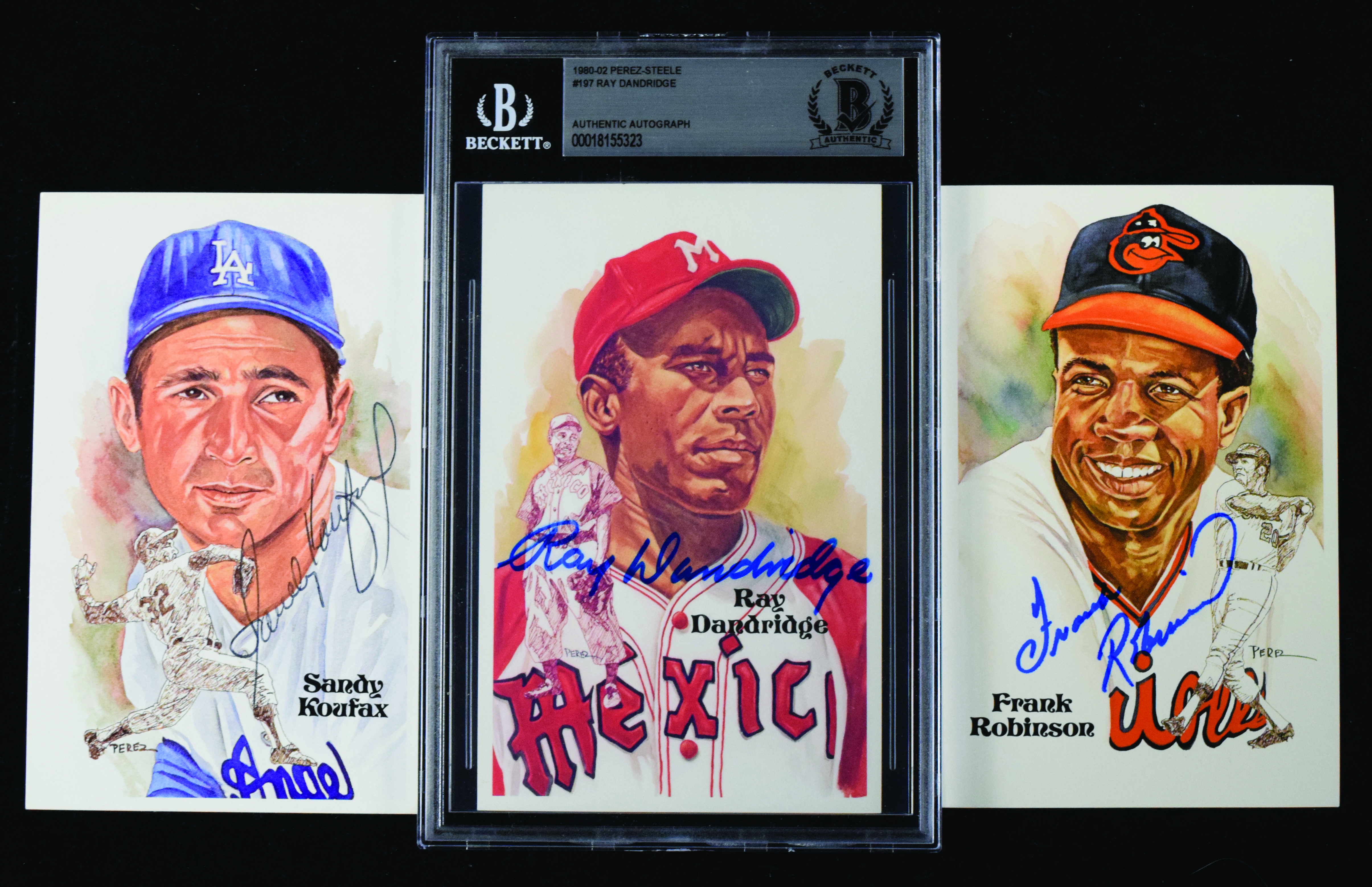 Description:Frank Robinson, Ray Dandridge, and Sandy Koufax signed Perez-Steele postcards - JSA & Beckett (NM-NM/MT). Dandridge and Robinson signed in blue marker, and Koufax signed in black ink. Signatures rate 8 to 10 out of 10. Dandridge is Beckett authenticated, while Robinson and Koufax are JSA authenticated: NM-NM/MT