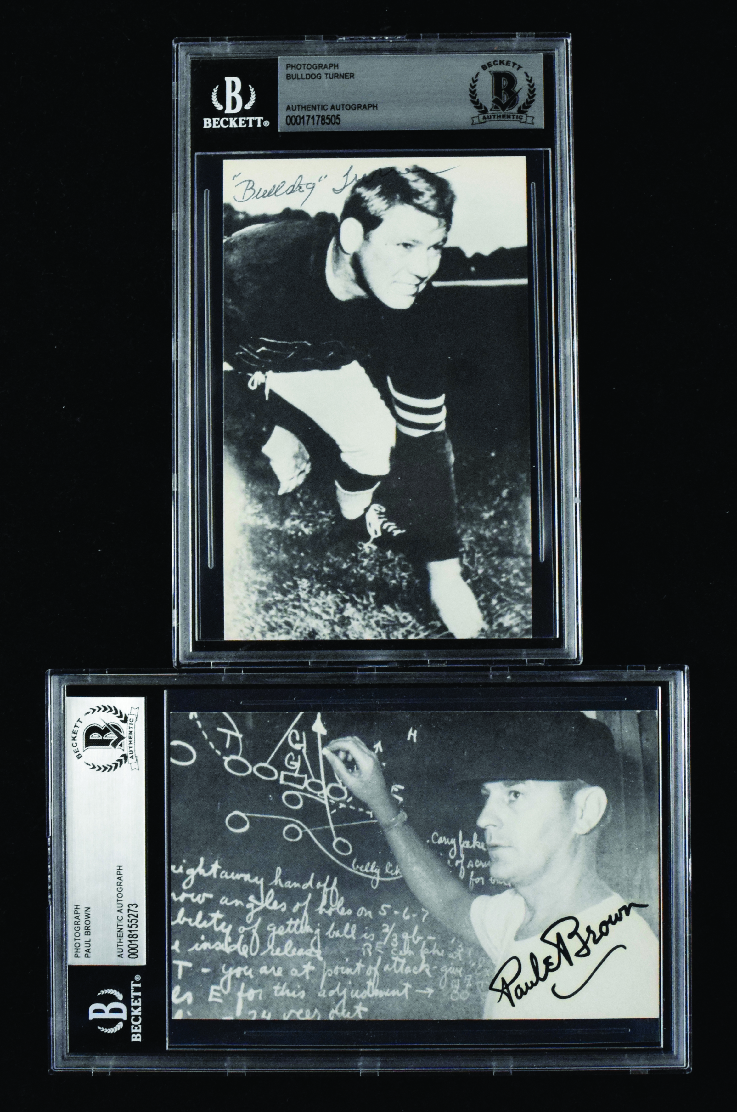 Description:Bulldog Turner & Paul Brown signed 1990 Radnor Graphic Art photo cards - Beckett (NM-NM/MT). Postcard size cards include #5 signed by Paul Brown in black marker rating 9/10 out of 10, and #29 signed by Turner in black ink rating 8 out of 10. Both are authenticated and encapsulated by Beckett: NM-NM/MT