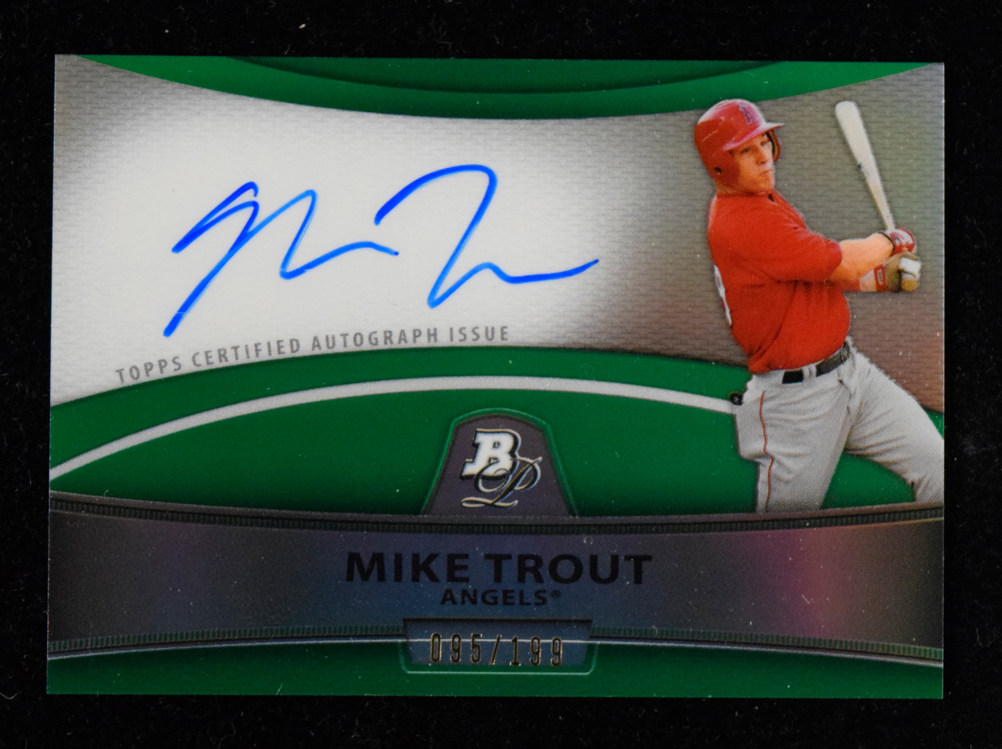 Description:Mike Trout autographed 2010 Bowman Platinum serial numbered rookie refractor card (NM/MT). 2010 Bowman Platinum "Prospect Autographs Green Refractors" #BPA-MT signed by Trout in blue marker. Signature rates 9/10 out of 10. The card is #ed 95/199: NM/MT ($500-$750)