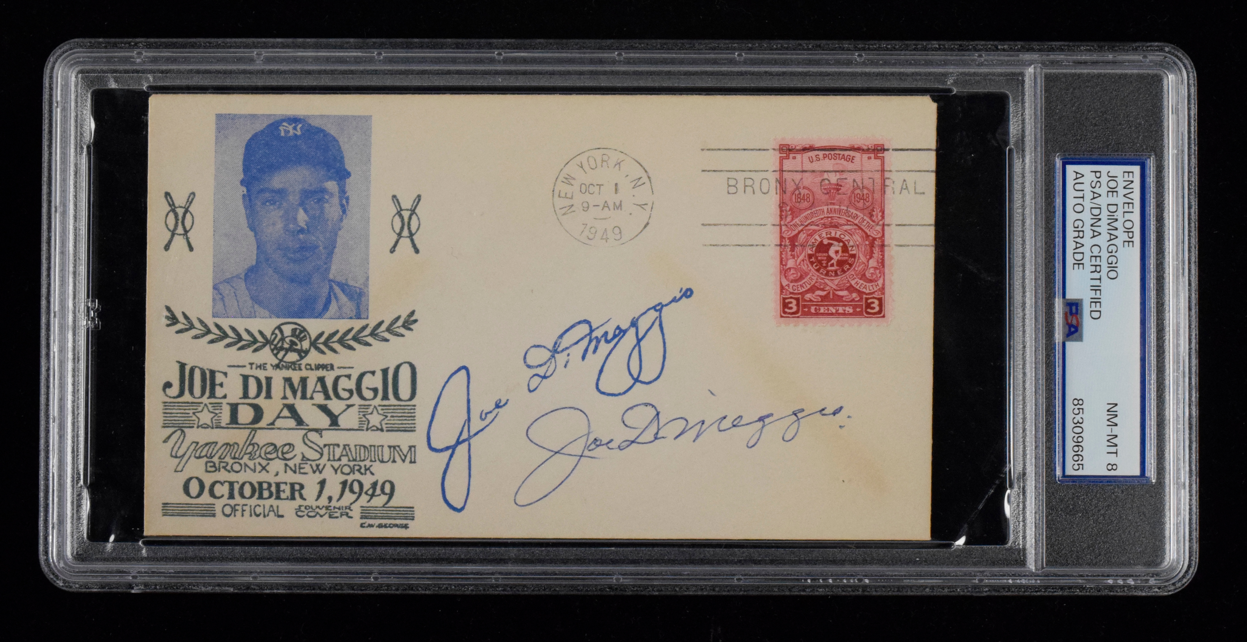 Description:Joe DiMaggio autographed 1949 Joe DiMaggio Day postal cover (PSA/DNA NM-MT 8) Signed in ink with the autograph graded NM-MT 8. Light toning: PSA/DNA NM-MT 8