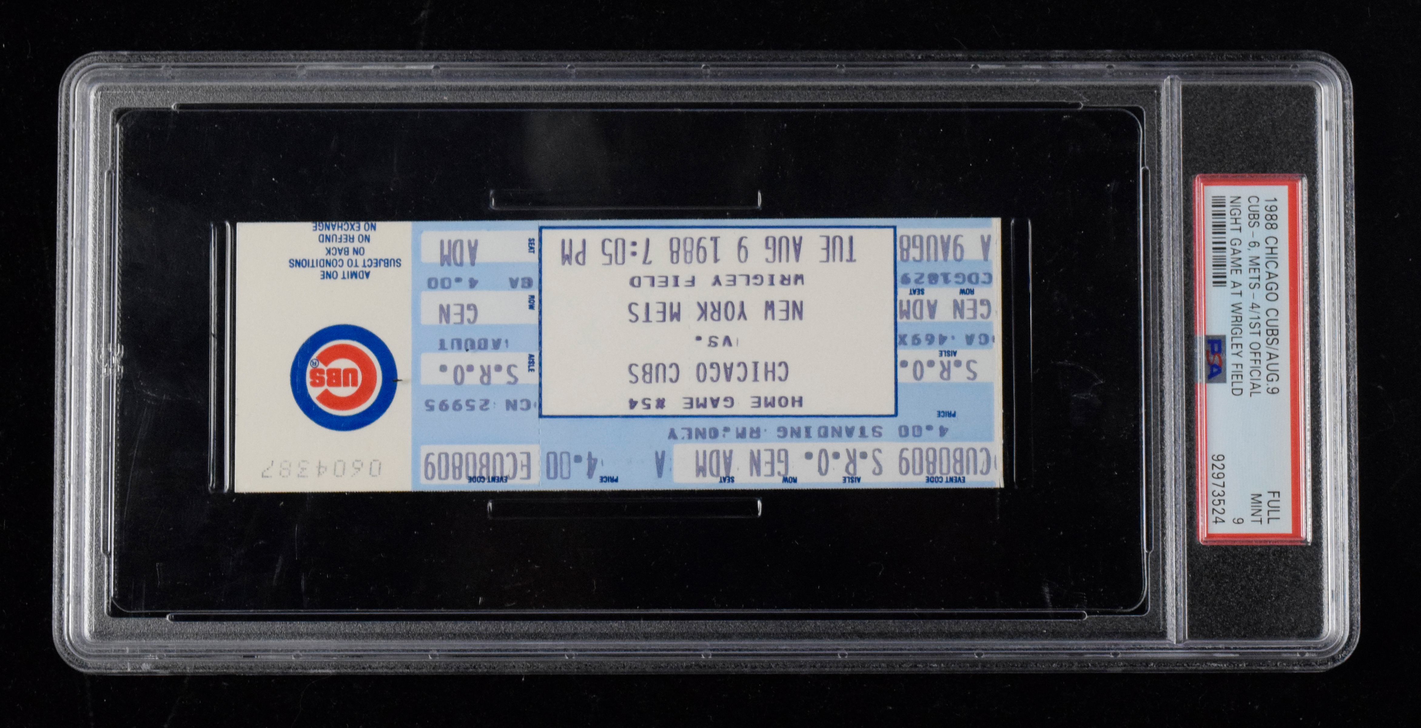 Description:August 9, 1988 Chicago Cubs first night game at Wrigley full ticket (PSA Mint 9 - only 2 higher) High grade ticket showing no mentionable wear. Only (2) have been graded higher: PSA Mint 9