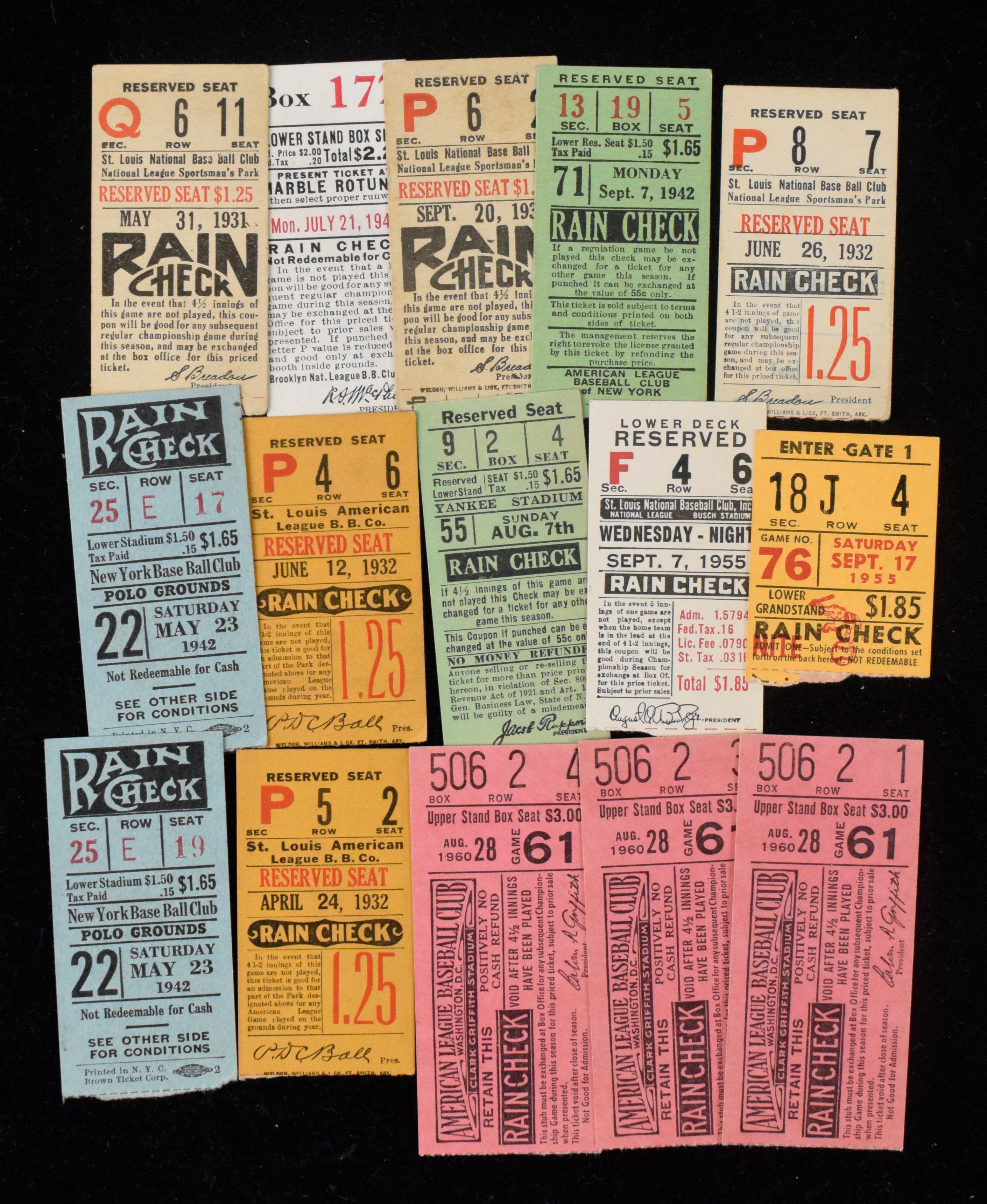 Description:Lot of (15) 1931-1960 baseball game ticket stubs (VG-EX/MT) Includes May 31, 1931 Cardinals vs. Reds; Sept 20, 1931 Cardinals vs. Robins; April 24, 1932 Browns vs. Indians; June 12, 1932 Browns vs. Senators; June 26, 1932 Cardinals vs. Cubs; August 7, 1938 Yankees vs. Indians (Gehrig home run - NOTE this stub is likely from 1938 however that can not be guaranteed - it could possibly be from 1932 however the face value price suggests it is likely 1938); July 21, 1941 Dodgers vs. Pirates; (2) May 23, 1942 Giants vs. Dodgers; Sept. 7, 1942 Yankees vs. Athletics; Sept 7, 1955 Cardinals vs. Giants; Sept 17, 1955 Athletics vs. White Sox; (3) August 28, 1960 Senators vs. Indians. Varying degrees/types of mostly light wear: VG-EX/MT