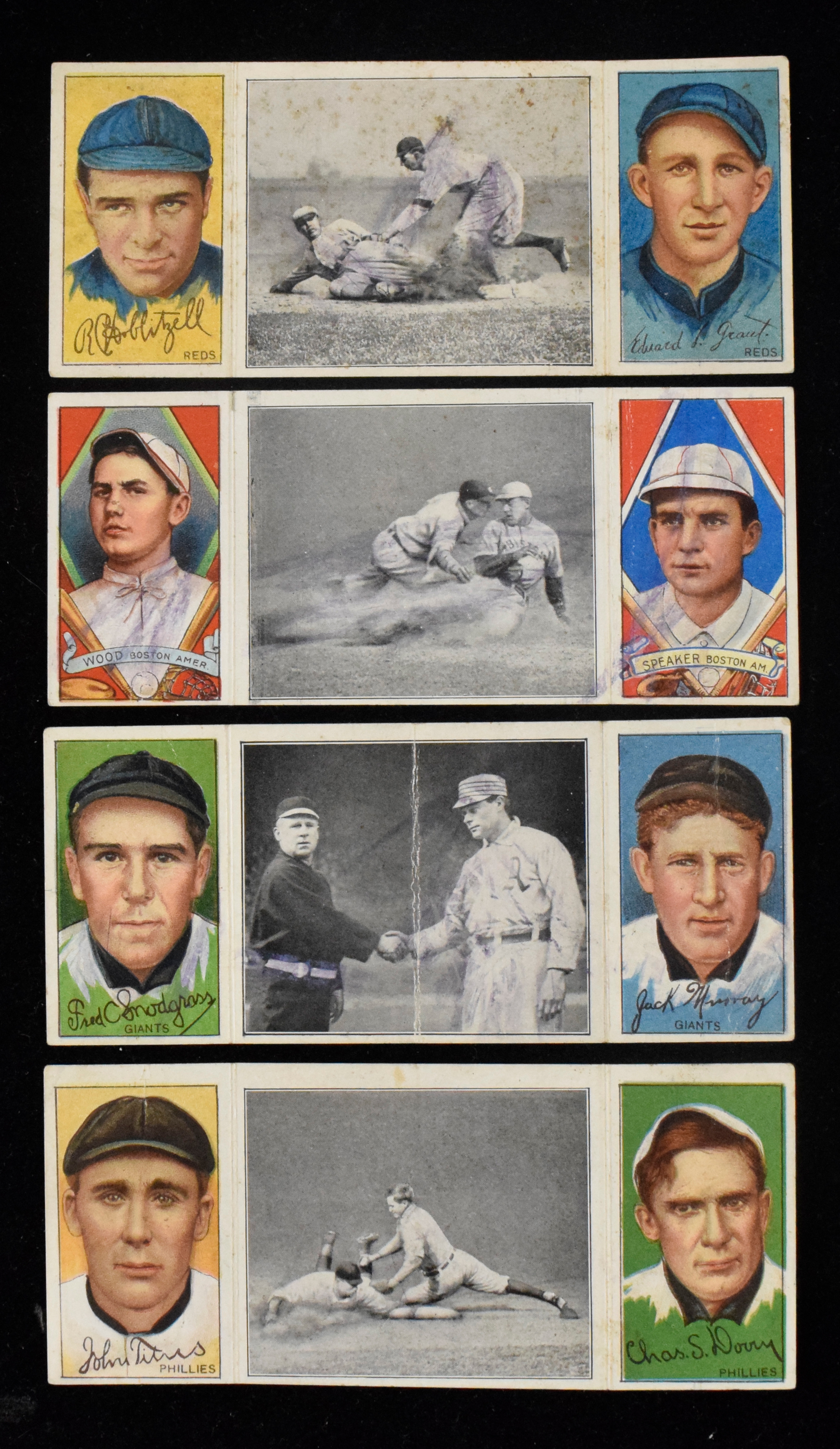 Description:Lot of (4) 1912 T202 Hassan Triple Folders including Tris Speaker and Joe Wood (PR-FR) Includes "Close At Third" - Tris Speaker and Joe Wood; "Grant Gets His Man" Grant and Hoblitzel; "Just Before The Battle" Murray and Snodgrass; "Dooin Gets His Man" Dooin and Titus. Varying degrees/types of wear throughout: PR-FR