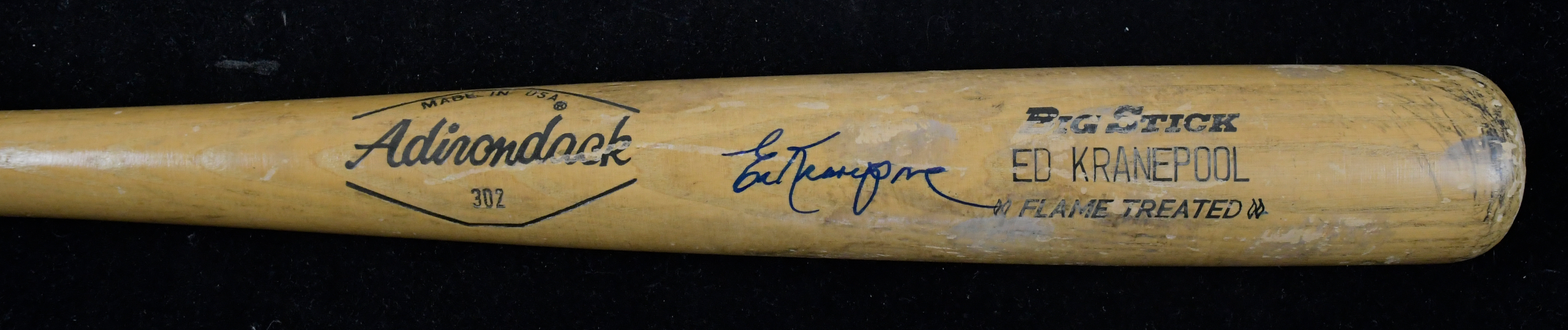 Description:c.1970s Ed Kranepool autographed professional model baseball bat (EX) Aridondack bat with "Ed Kranepool" name block lettered in the barrel measures 35.25" long and has model "357A" factory stamped in the knob. Number "7" is written on either end in vintage marker. Strong use with ball/contact marks covering the hitting surface and there is a handle crack. Signed in marker rating 8/9 out of 10: EX