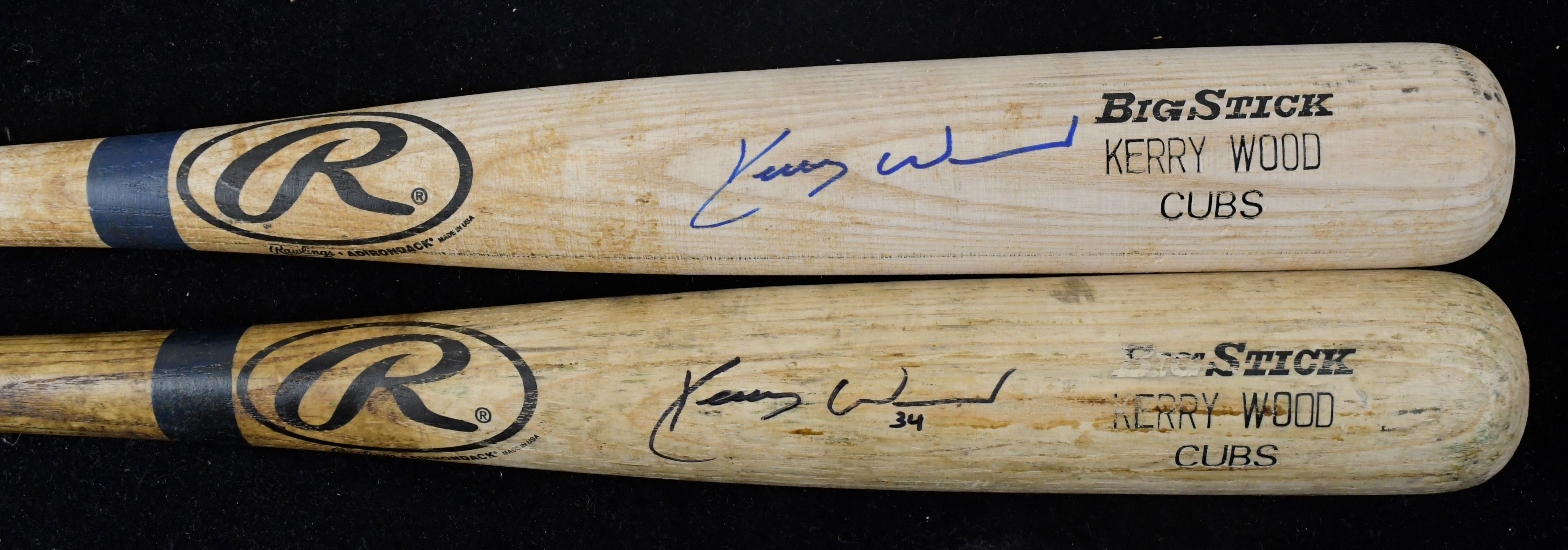 Description:1998 and 2000 Kerry Wood autographed professional model baseball bats (EX) Pair of Rawlings Big Stick model 170B bats, each with "Kerry Wood, Cubs" block lettered in the barrel (33.75" and 34.5" long). Bat with 1998 date code shows strong use with a handle crack, the 2000 has mild surface wear and a scattered ball mark or two. Both have number "34" (and other info) written on either end, a nice coat of pine tar, and each is signed in marker rating 7 to 8 out of 10: EX