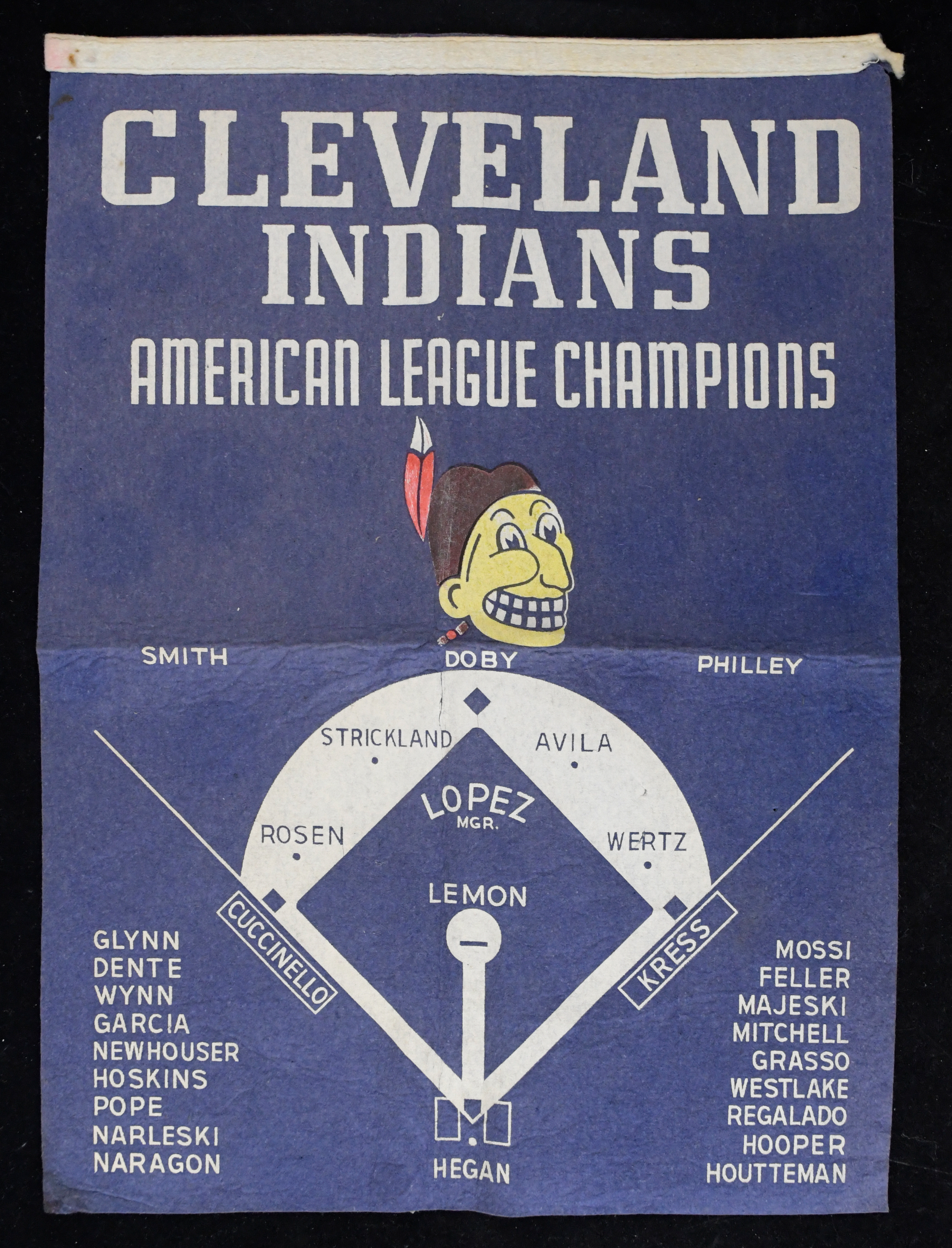 Description:1954 Cleveland Indians American League Champions rectangular pennant/banner (VG) Very nice display piece measures 17"x23" with screened on titling, graphics, and player names. Some minor discoloration with fold lines (these could likely be lessed by use of an iron from the back however the horizonatal would still be prominent) and some other mostly minor scattered flaws. Top edge has tack holes, some more pronounced discoloration at left edge, and small amount of fraying at right: VG