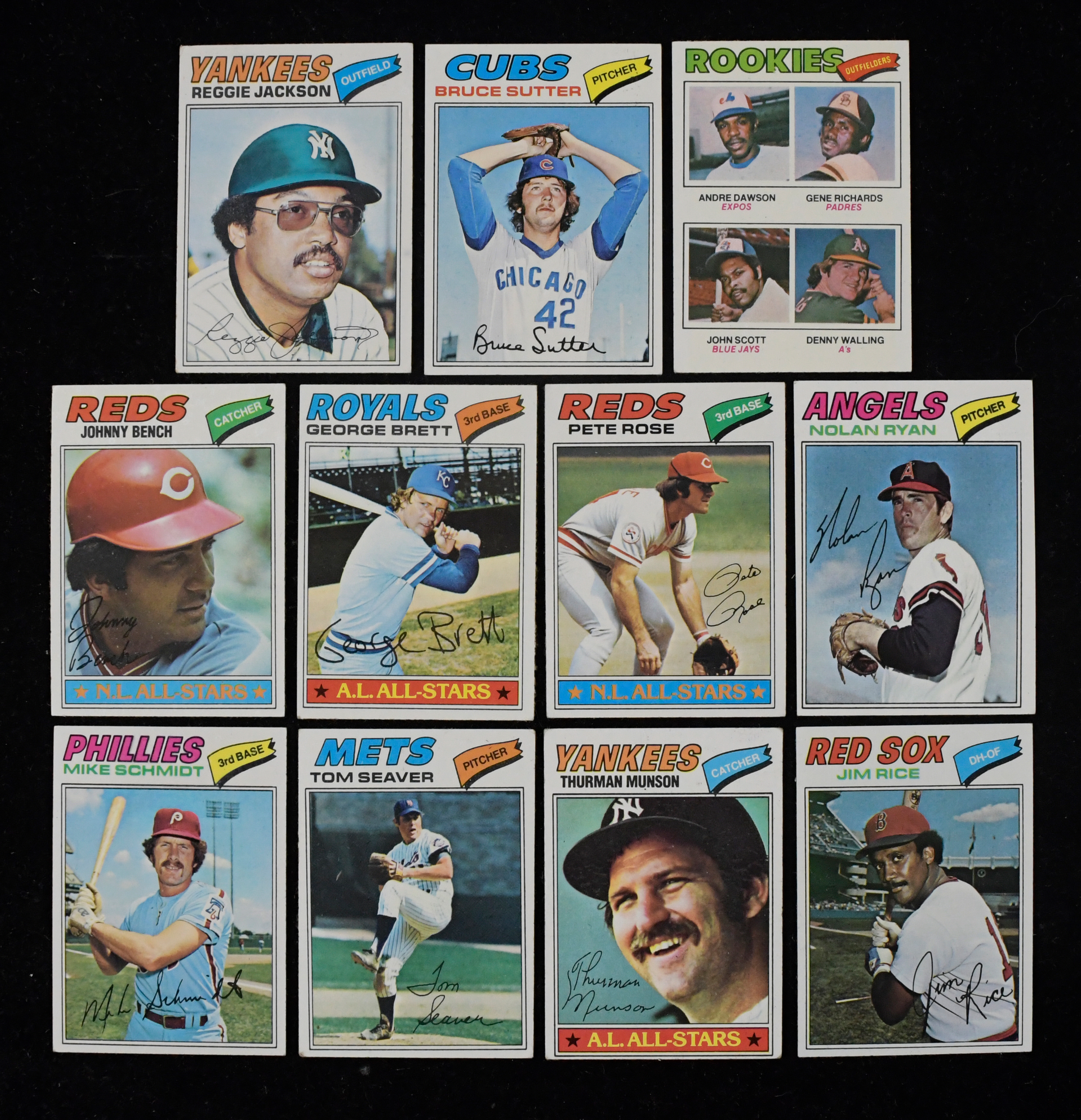Description:1977 Topps Baseball near complete set (Avg. EX) Missing #633 and possibly a handful of other cards. Keys: #10 Jackson (GD/VG), 60 Rice (EX), 70 Bench (VG), 140 Schmidt (VG), 144 Sutter (EX), 150 Seaver (VG), 170 Munson (GD), 450 Rose (VG), 473 Dawson (VG), 580 Brett (GD/VG), and 650 Ryan (VG/EX). Average EX condition throughout with small portion lesser: Avg. EX