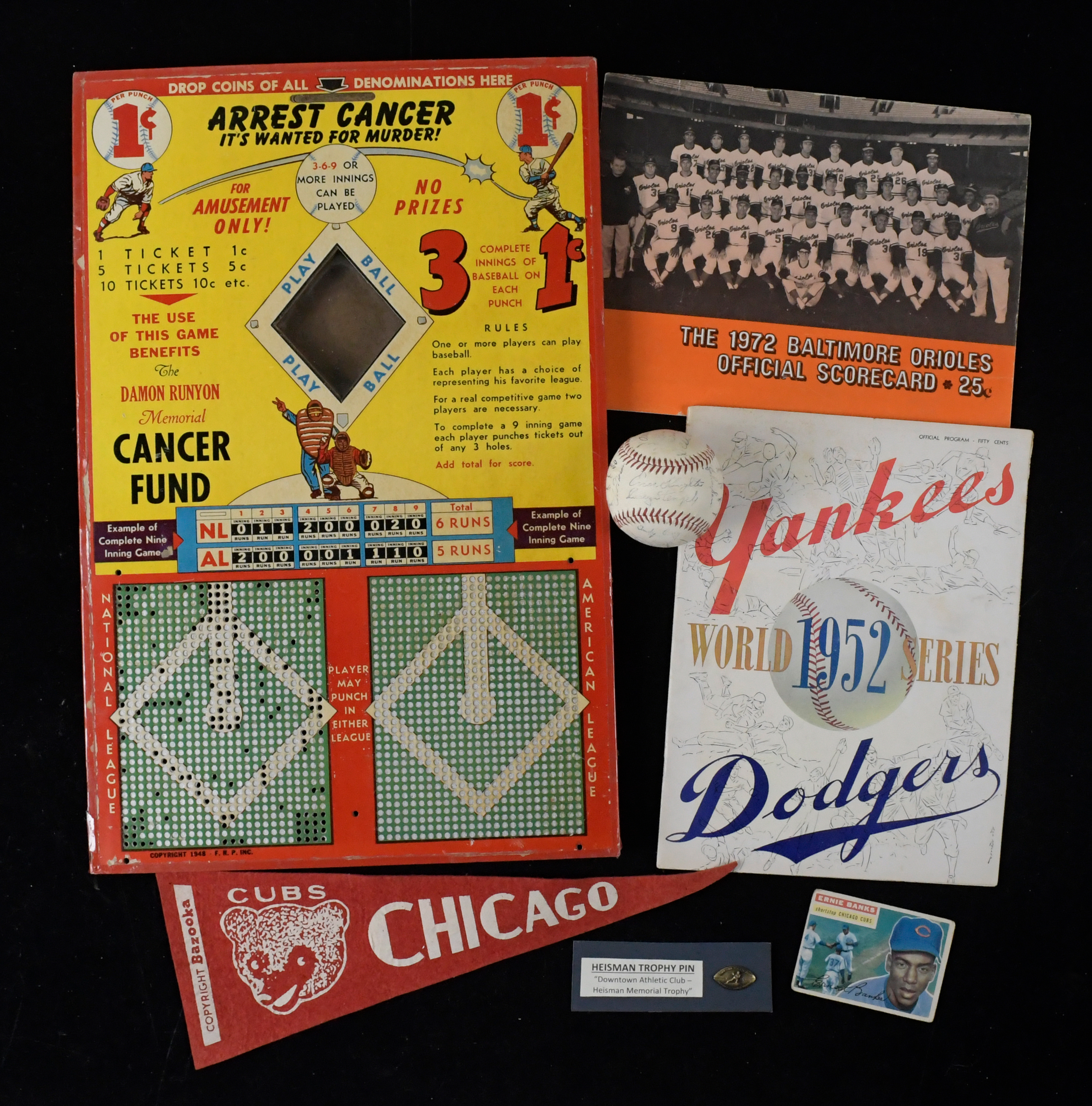 Description:Large lot of mostly baseball related trading cards, souvenirs, and other memorabilia (FR-NM) Lot fills 3 medium tubs/boxes. Includes 1956 Topps Ernie Banks (FR); oversized 13"x20" baseball themed punchboard game done to solicit donations for the Damon Runyon Memorial Cancer Fund (1948 copyright date). Some holes are punched and there is other mild wear; (3) acetate negatives of baseball team photos with notations on the envelope in which the are stored indicating that they show c.1931 small town teams from "Portola & Loyalton" and another; early 1950s Yankees souvenir ball with facsimile signatures; vintage Chicago Cubs 14.25" long Bazooka pennant; Downtown Athletic Club Heisman Trophy lapel pin; 1952 World Series program; several 1970s Orioles scorecards/publications; handful of Babe Ruth commemorative postal covers (modern); group of 1975-76 Topps Hockey cards (incl. Guy Lefleur, Rod Gilbert, Jean Ratelle, and Brad Park); several New Jersey Devils souvenir pins; additional modern trading cards (mixed sports); (2) binders of modern Chicago Cubs cards (with some scorecards/programs mixed in); 1967 Senators yearbook, scorecard from Opening Day, and (2) other 1960s Senators scorecards; a few modern bobble heads; pair of autographed cleats from unknown player; and some additional mostly baseball related souvenirs/trinkets. Varying degrees/types of wear throughout: FR-NM