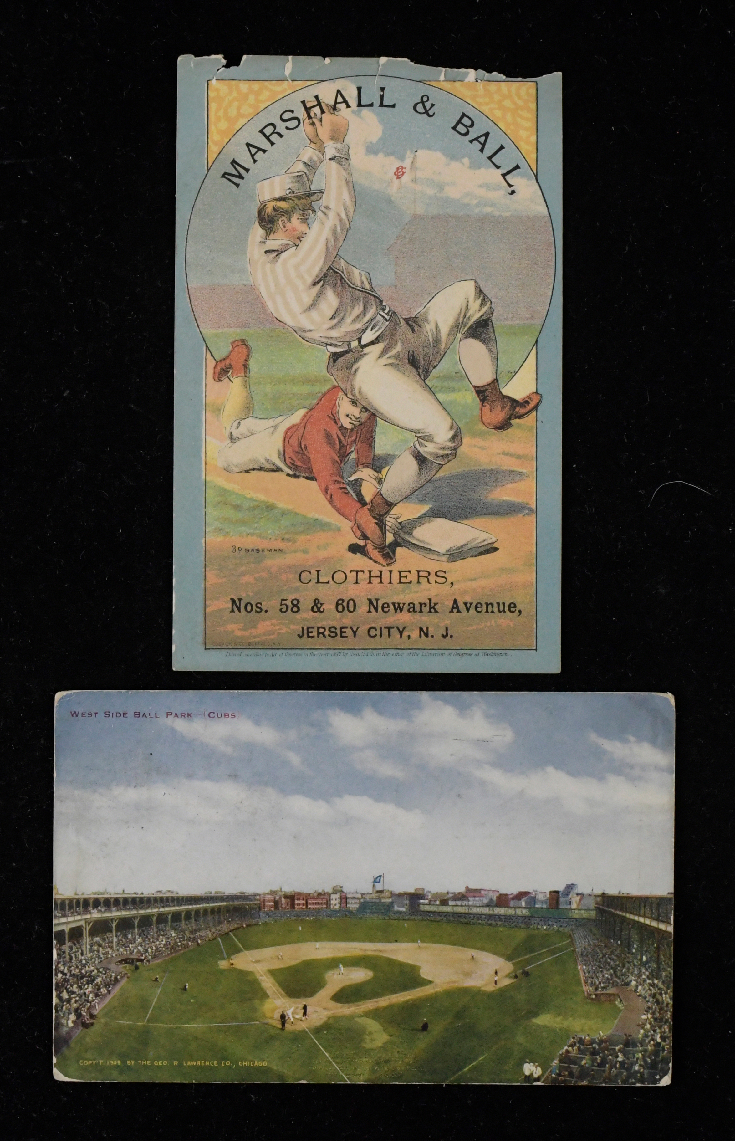 Description:1882 Cosack & Co. baseball trade card with c.1912 West Side Park (Cubs) postcard (PR-FR) Includes 1882 Cosack & Co. baseball tade card with Marshall & Ball advertising (PR); West Side Ball Park in Chicago (Cubs) postcard which has handwritten address and sentiment on back along with 1912 postmark (FR): PR-FR