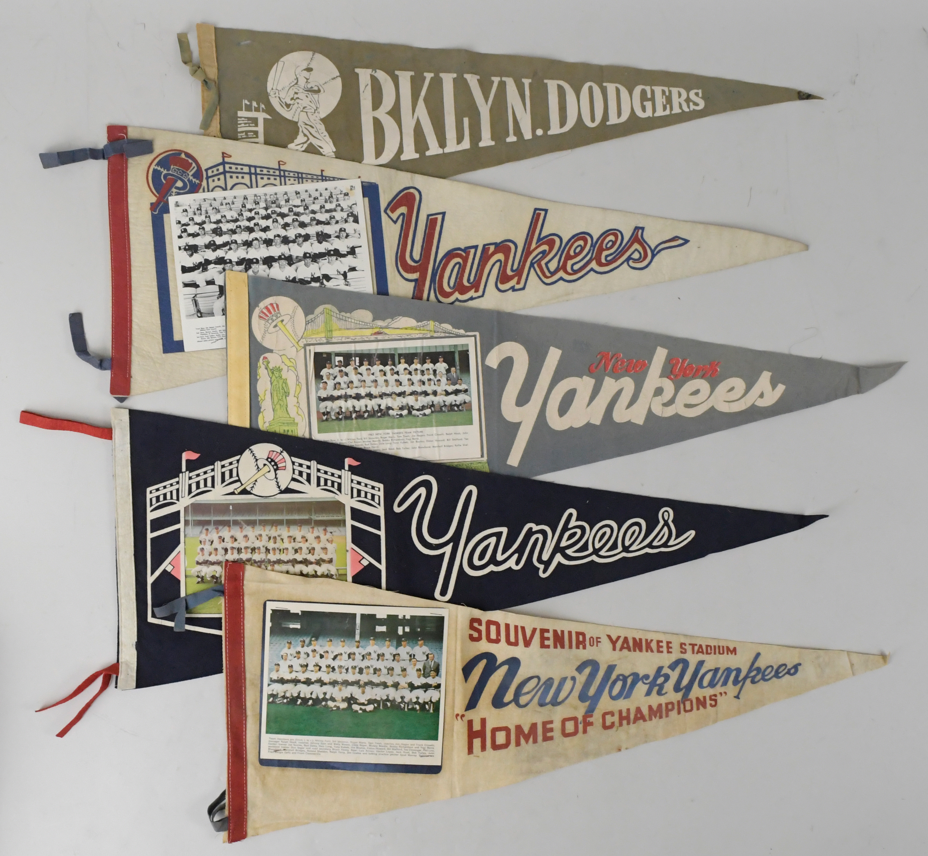 Description:Lot of (7) c.1950s-60s baseball team pennants incl. Dodgers and Yankees (PR-VG) Includes Brooklyn Dodgers (three quarter size); Chicago Cubs (very PR with missing pieces); New York Yankees team photo pennants from 1961 (among the better condition pieces in the lot), 1962, 1962/63, and 1969; Washington Senators (with souvenir pin attached). Also includes a modern Chicago Cubs pennant. Varying degrees/types of wear throughout with most pieces notably effected: PR-VG