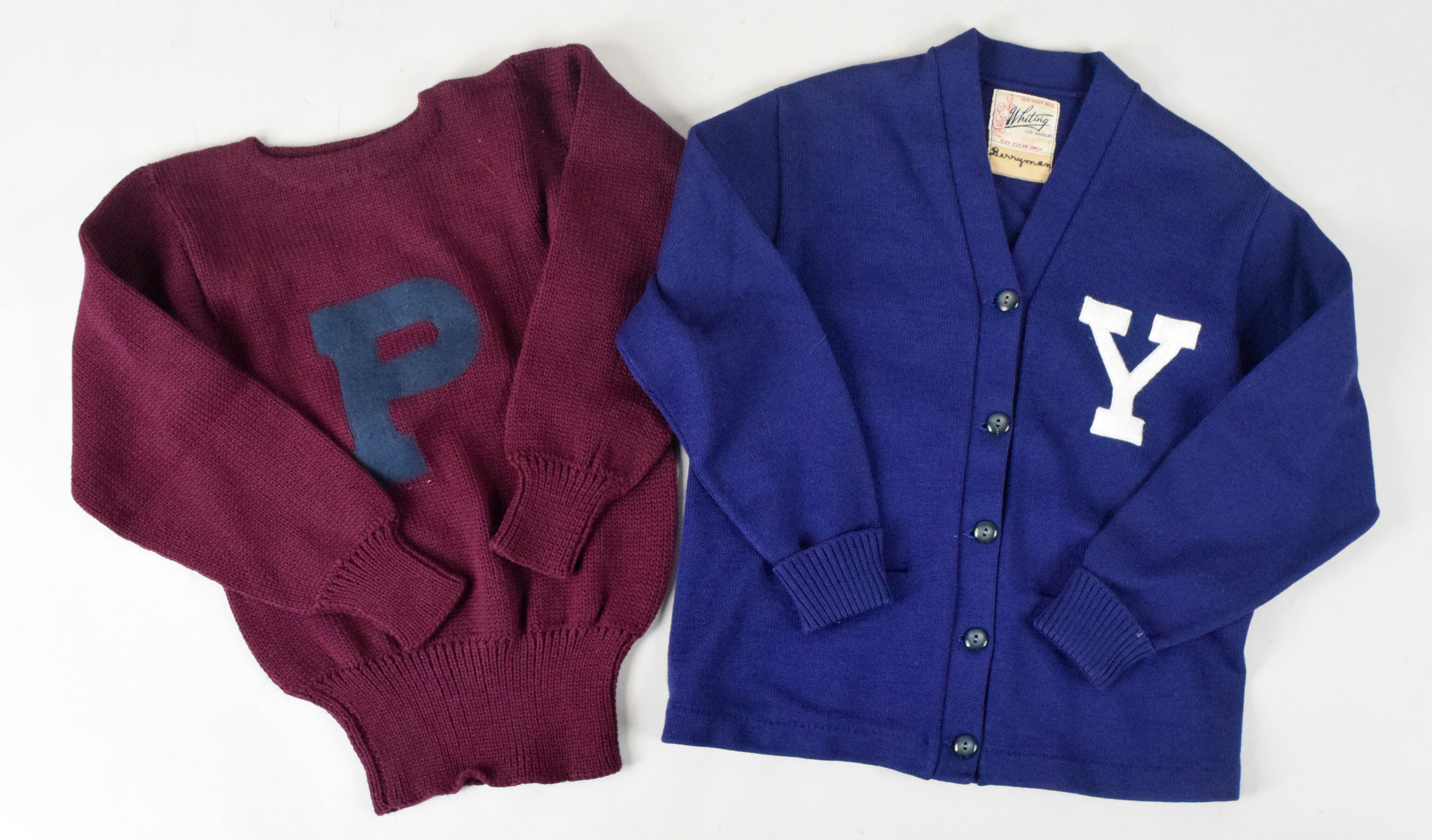 Description:Lot of (5) vintage letterman sweaters (EX-EX/MT). Includes Lowe & Campbell maroon sweater with white "U" patch, O'Shea Knitting Mills red sweater with white "I" patch, (2) Pearson burgundy sweaters both with black "P" patch (likely Penn), and Whiting blue sweater with white "Y" patch and "Berryman" name tag (possibly Yale): EX-EX/MT