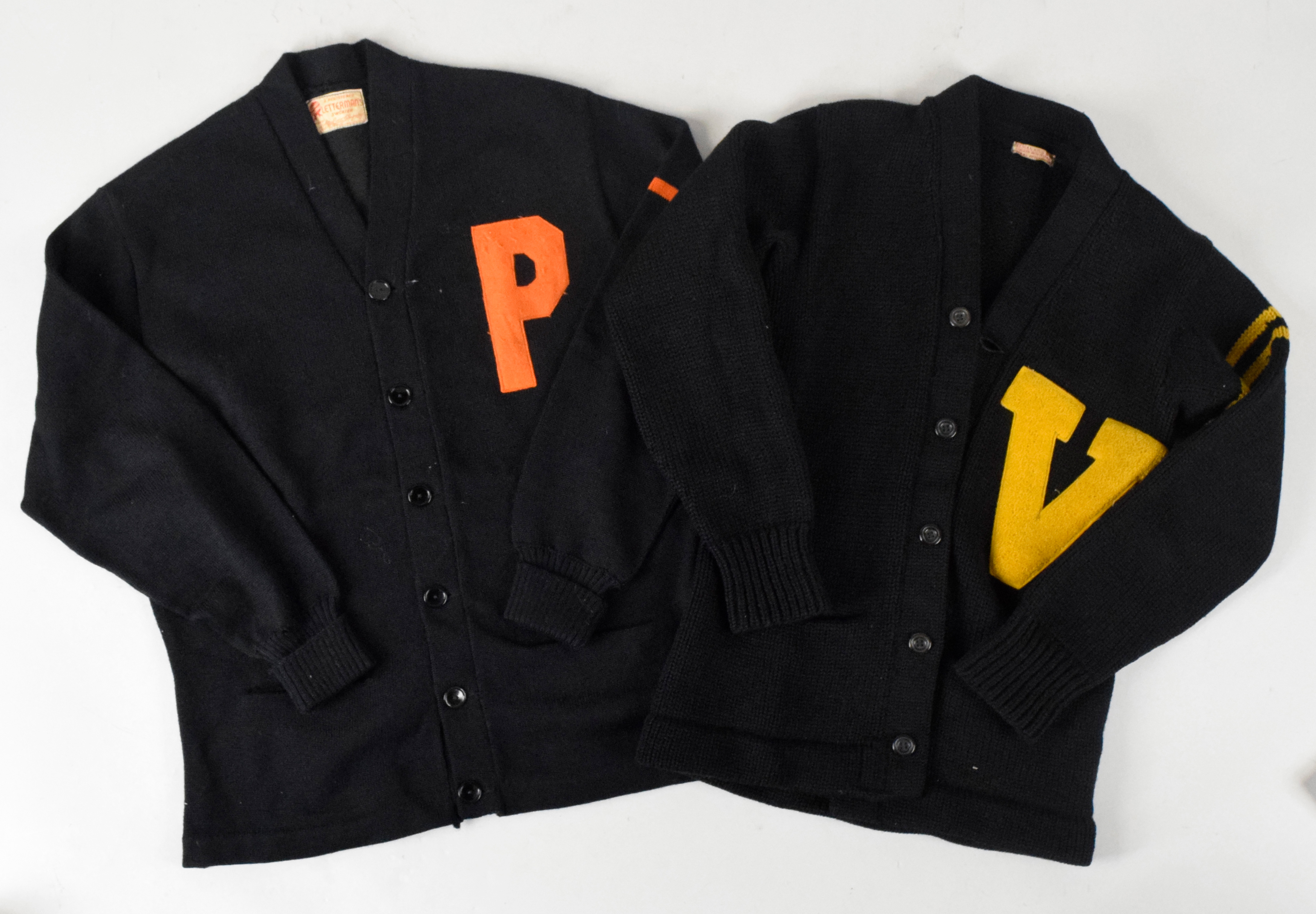 Description:Lot of (8) vintage letterman sweaters (VG/EX-EX/MT). Includes an Olympia Knitting Mills burgundy sweater with blue "K" and white "S" patches, Dehen burgundy sweater with white "M" patch and "W. Boyle" name under the collar tag, untagged burgundy sweater with white-trimmed burgundy "M H S" patch which has small basketball patch, untagged maroon sweater with gold "O" patch, Whiting black sweater with orange "P" patch and "LIEBSCHER" name tag inside, untagged black sweater with orange "P" patch, Treman-King & Co. black sweater with gold "V" patch, and Broadway Knitting Mills white sweater with brown "KN or NK" patch which has a small wrestling patch: VG/EX-EX/MT
