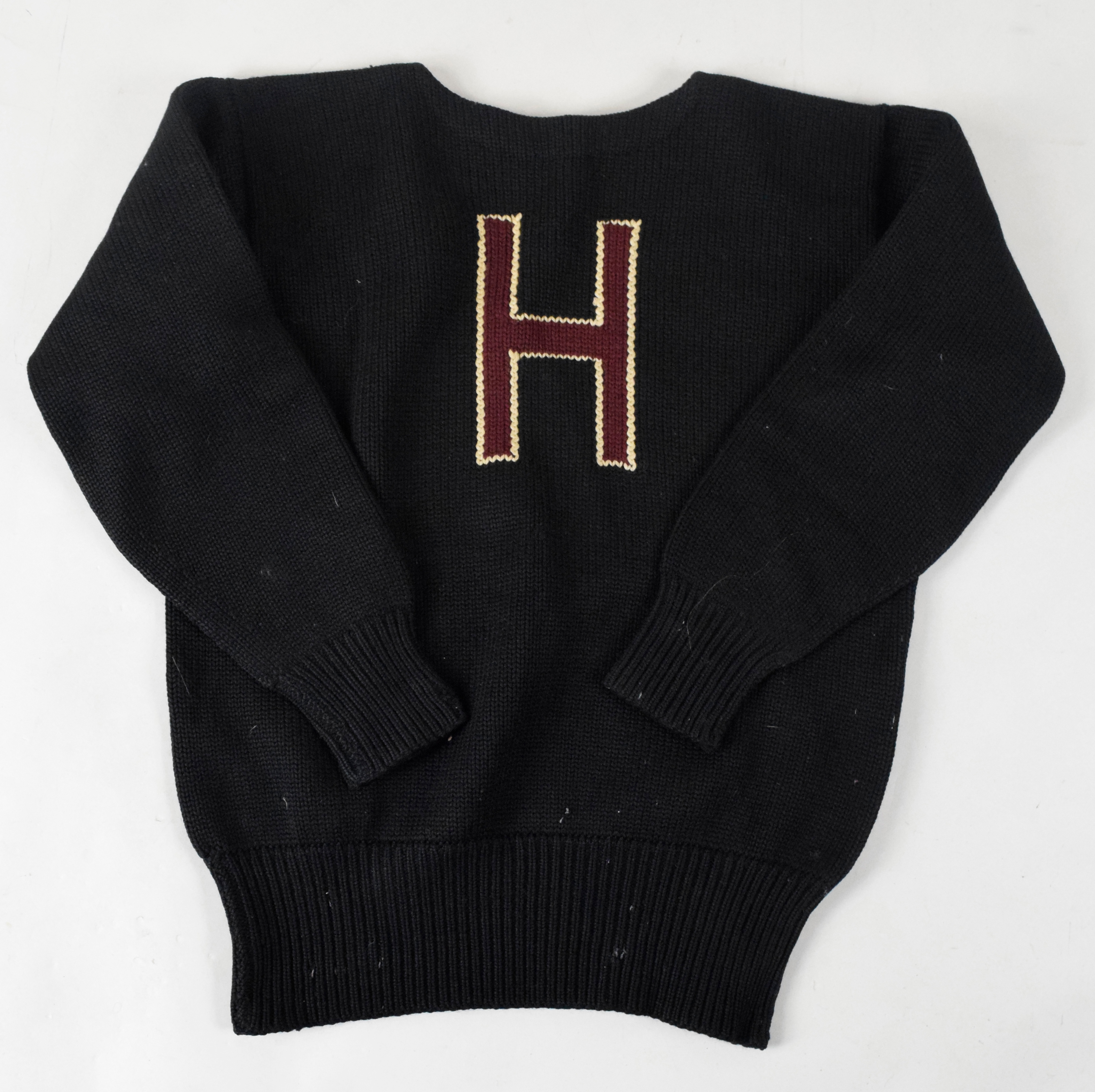 Description:Harvard University vintage letterman sweater, c.1920s-30s (EX). Mormac Sporting Goods black sweater with white-trimmed maroon "H" sewn on the front. Stain on the Mormac tag: EX