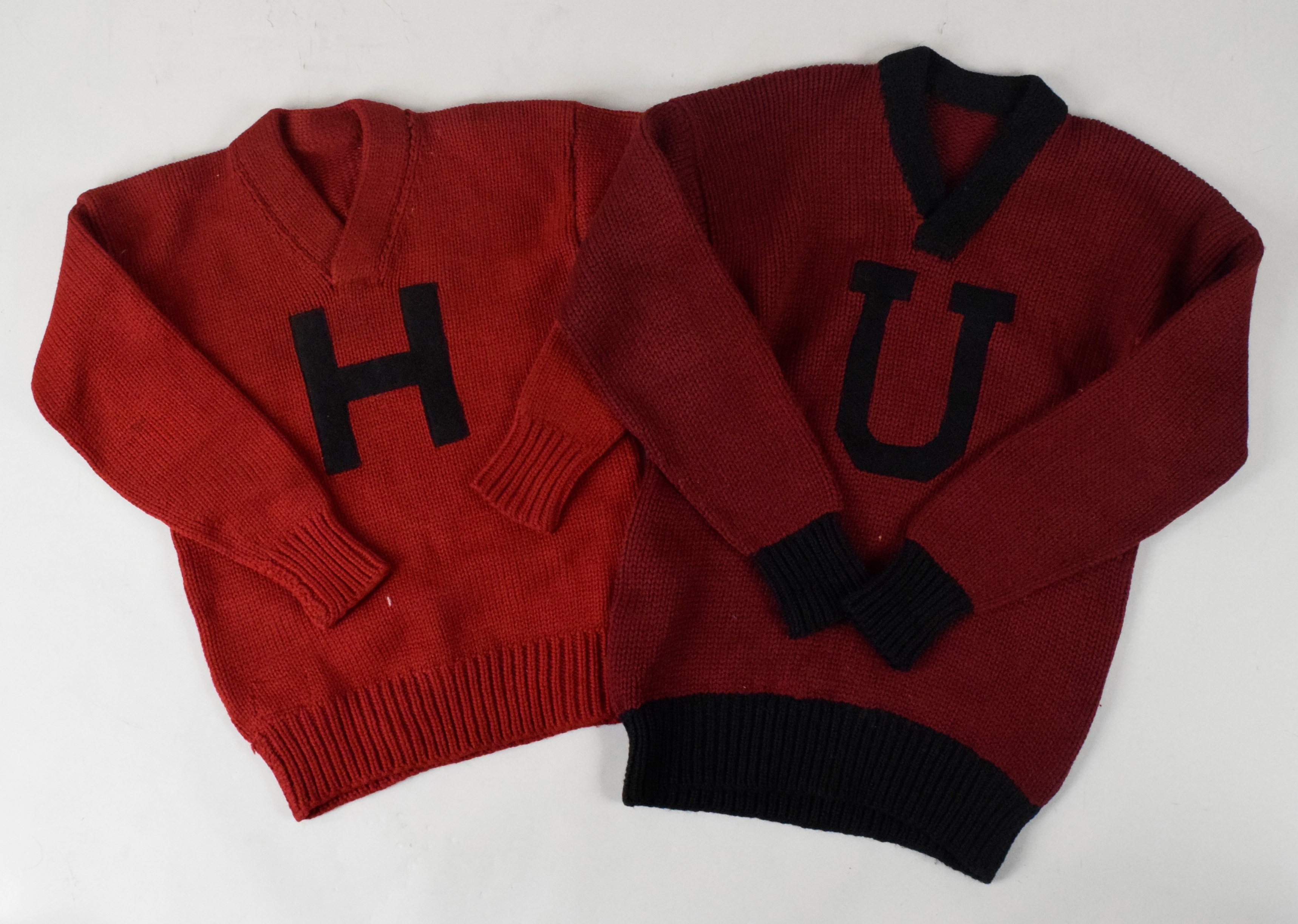 Description:Lot of (4) vintage Spalding sweaters (VG/EX-EX/MT). Includes black sweater with gold "1930" across the front (VG/EX interior name tag almost entirely torn away), navy blue sweater with white "1941" across the front (EX/MT), red sweater with black "H" patch (EX tag wear), and burgundy sweater with black trim and black "U" patch (EX/MT).