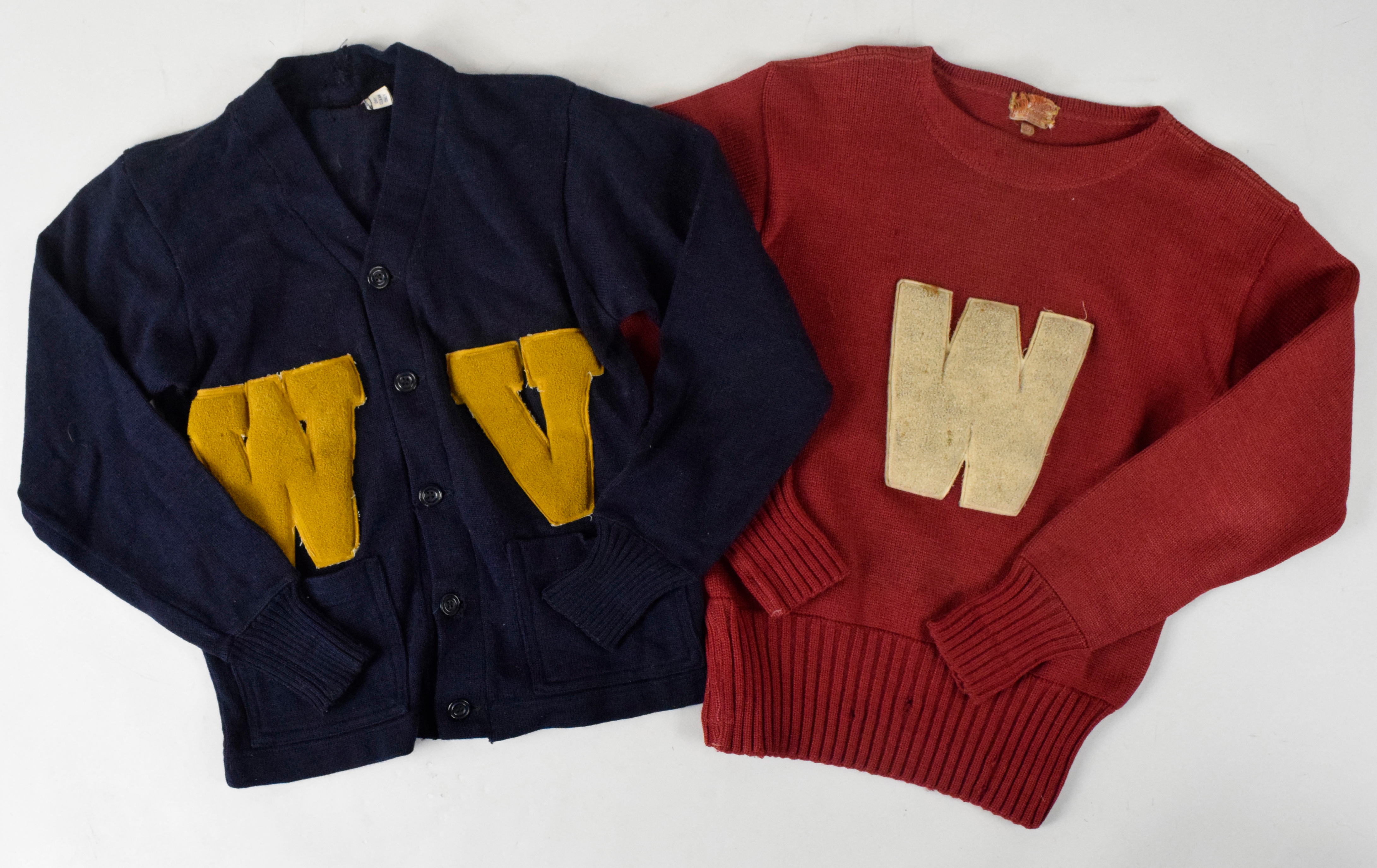 Description:Lot of (7) vintage letterman sweaters (VG/EX-EX/MT). Includes untagged black sweater with red "H" patch, Whiting crimson sweater with white "H" patch and "Alliguie" name sewn below the collar tag, Standard Pennant Co. black sweater with orange "H" "BAND" patch and "Williams Burns" name sewn inside the tail, Rugby Knitting Mills burgundy sweater with black "I" patch and "37" basketball patch on the left sleeve, Ballantyne red sweater with black and yellow stripes and black "I" patch, untagged blue sweater with orange "I" patch, and All Wool white sweater with red "LV" patch: VG/EX-EX/MT