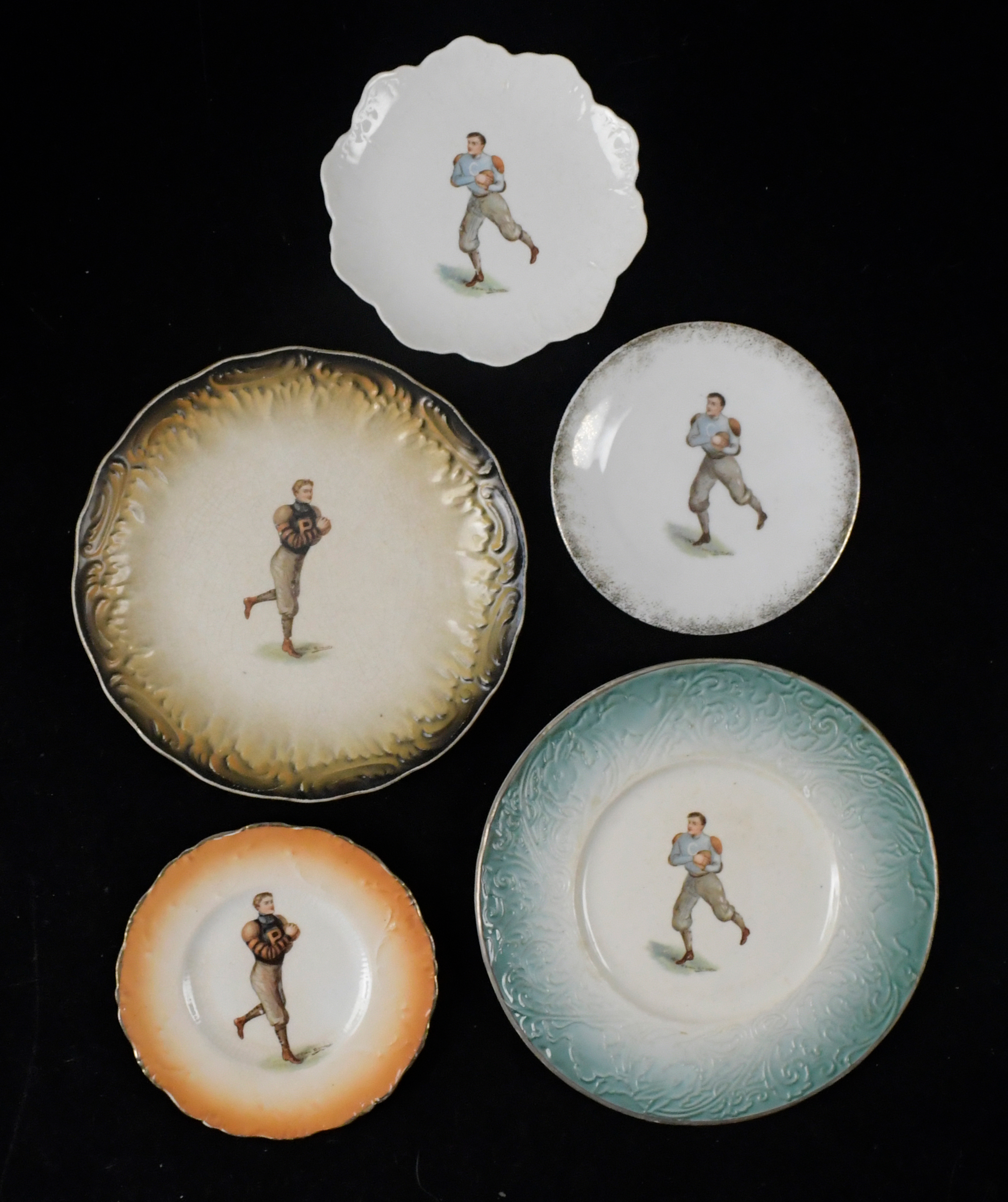 Description:Lot of (5) vintage Columbia & Princeton football plates with F.Earl Christy designs, c.1910s (VG-EX). Includes 9" Columbia plate (EX), 8.5" Princeton plate (VG), 6.25" Columbia plate (VG), 6" Columbia plate (EX), and 6" Princeton plate (VG/EX).