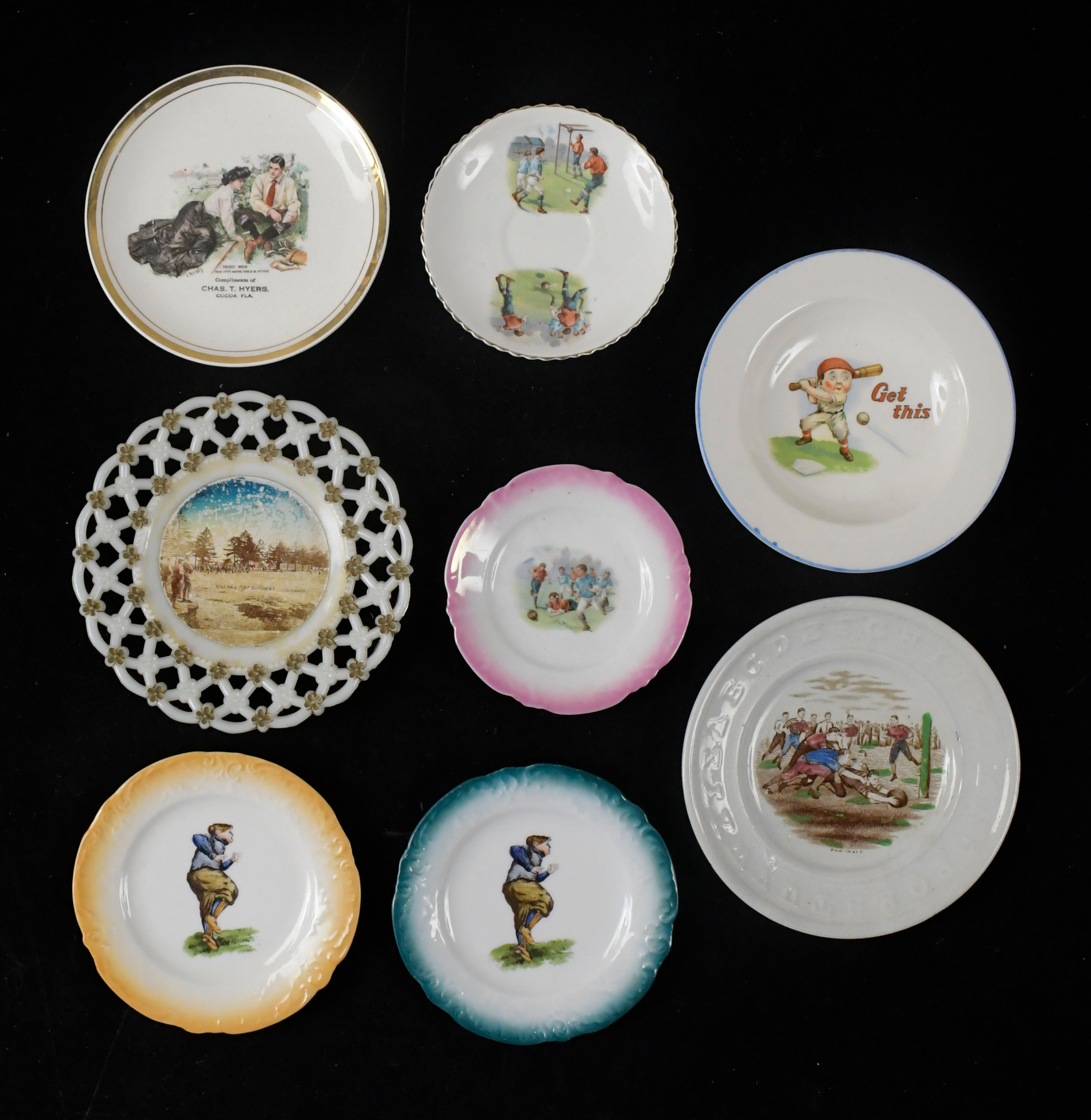Description:Lot of (8) vintage decorative sports themed plates, c.late 1800s - 1930s (VG-EX/MT). Includes 7.5" "Base Ball Fort Slocum, NY"; 7.5" ABC football plate; 7" Maruhon Ware "Get This" baseball dish; 6.75" plate with golf scene by F. Earl Chrity; (2) 6.25" football player plates; and (2) 5.5" soccer plates. Most appear to average VG/EX overall. Range: VG-EX/MT