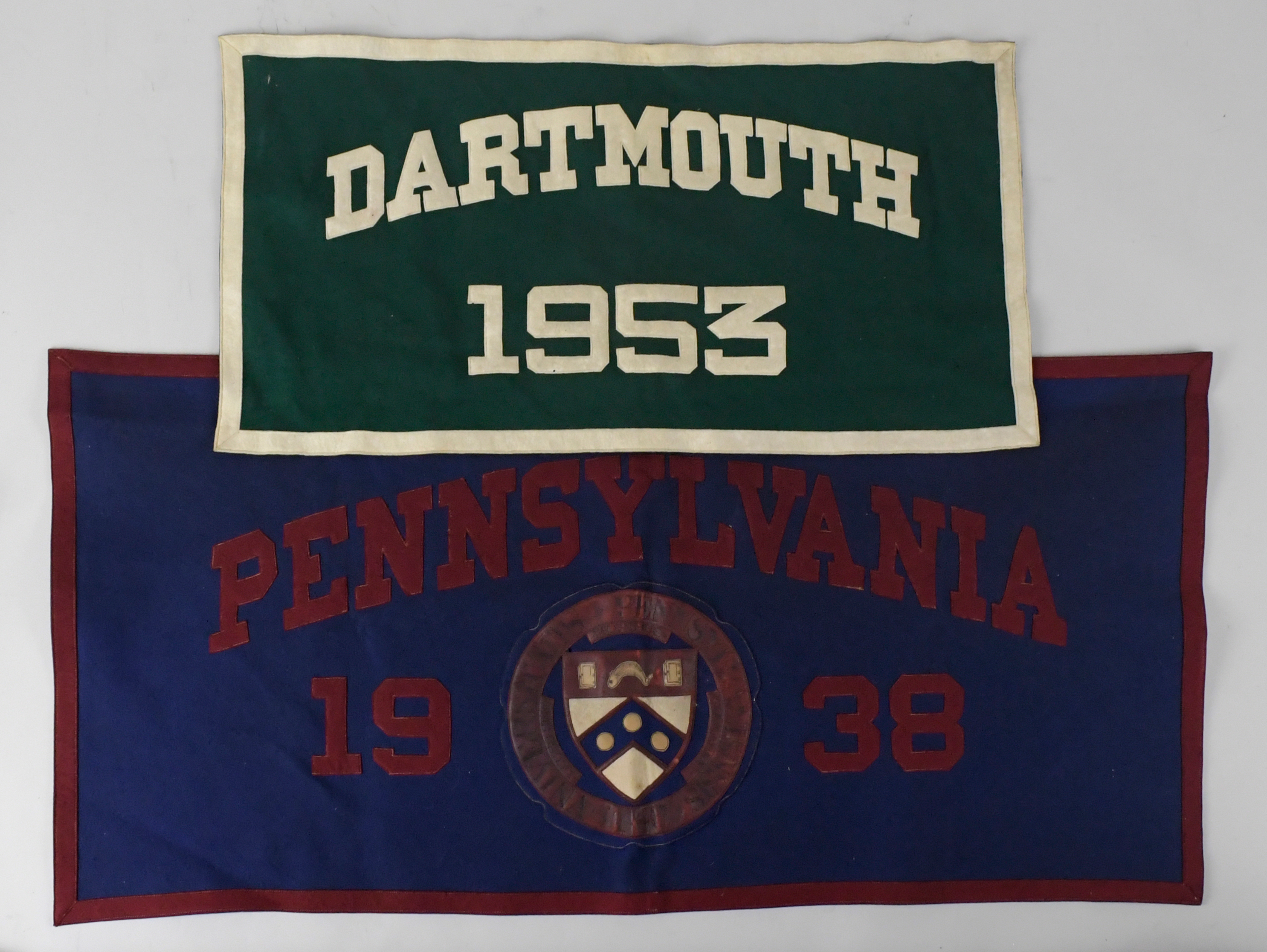 Description:1938 Pennsylvania banner and 1953 Dartmouth banner (EX-EX/MT). Includes 23"x46" 1938 Pennsylvania banner, and 17"x32.5" 1953 Dartmouth banner. Both have Chicago Pennant Co. tag: EX-EX/MT