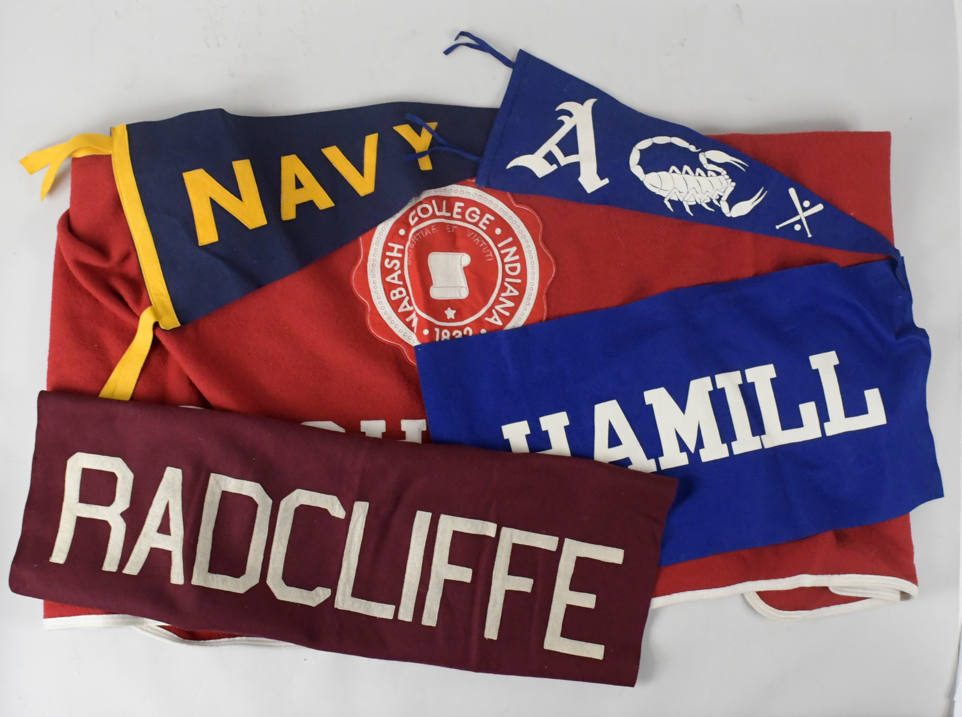 Description:Lot of (6) vintage banners, blanket, and pennants (EX-NM). Includes 37"x59" blank blanket with orange "B" patch, 55"x68" Wabash College banner, 20"x34" Radcliffe banner, 14"x29" Hamill banner, 29" Emblem & Pennant Co. Navy pennant, and 25.5" Alacranes del Almendares baseball team pennant: EX-NM