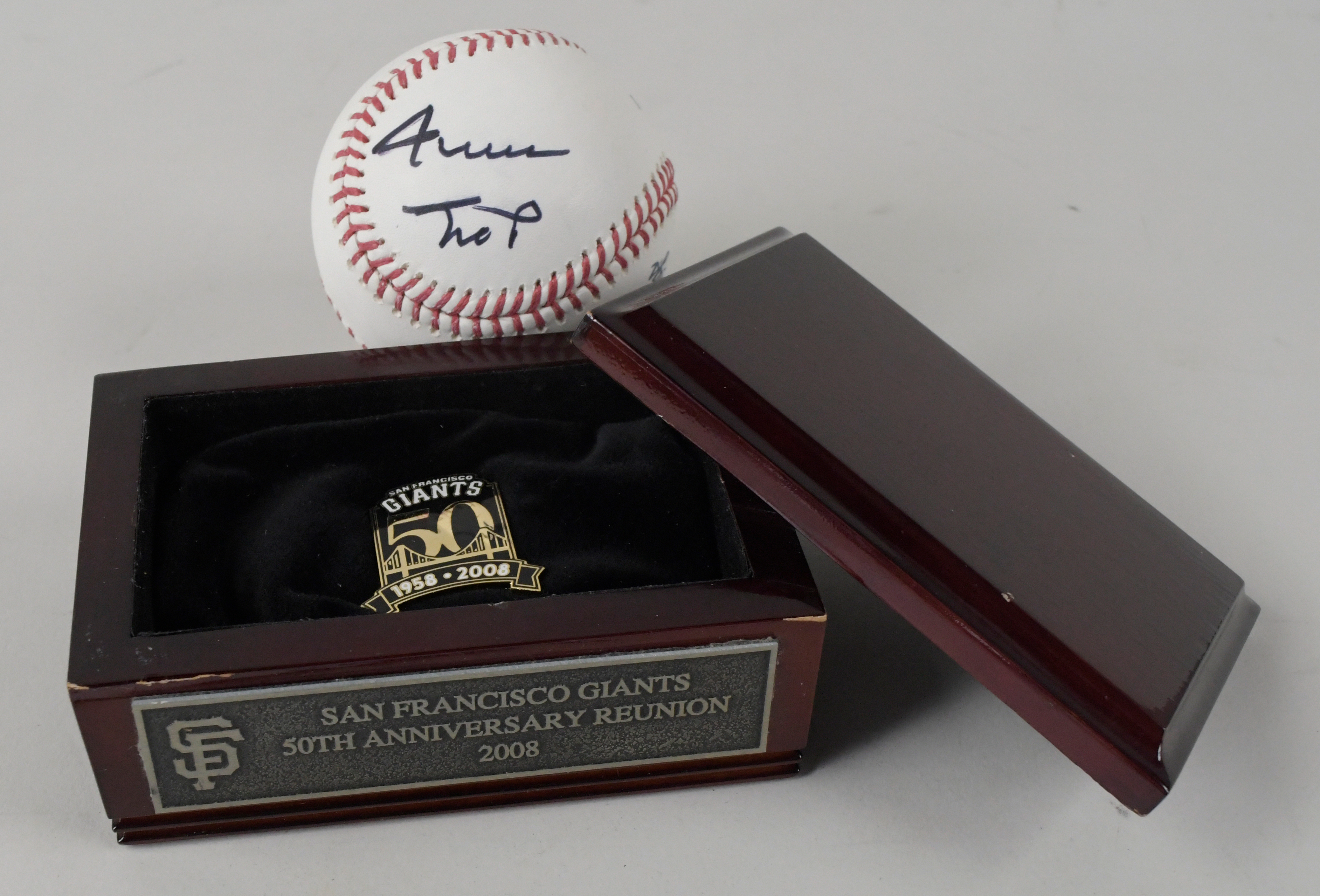 Description:2008 Giants 50th Anniversary Reunion presentational pin with Willie Mays signed baseball (EX-NM) Small wooden presentation style box (4.75"x3.25"x2.25") has a metal placard affixed to the front with "San Francisco Giants 50th Anniversary Reunion 2008" text beside a team logo. Inside is a 50th Anniversary logo lapel pin. Box shows a touch of light wear; Rawlings B.Selig OML baseball signed "Willie Mays" on the side panel in marker rating 8-8/9 out of 10. Ball has a "Mays Authentic Signature" sticker affixed. Includes certificate of provenance from the Willie Mays Collection: EX-NM ($400-$600)