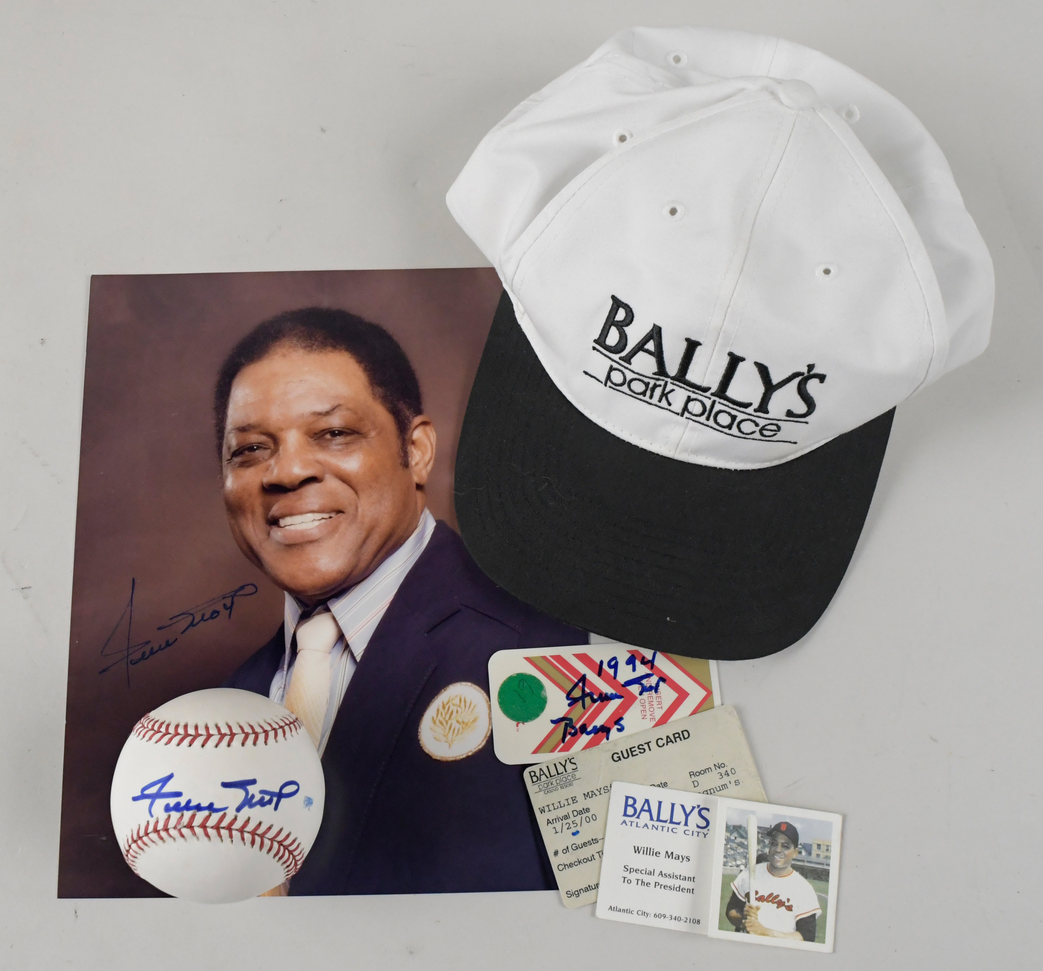 Description:Willie Mays Bally's Casino related lot with (3) autographed pieces (GD-NM) Includes Rawlings baseball with Bally's logo and "Willie Mays 70th Birthday Celebrationâ?¦2001" text printed on, signed "Willie Mays" in marker rating 9 out of 10 (small stray mark beside autograph); hotel room key card which has been signed "1994 Willie Mays Ballys" in marker rating 9 out of 10; 8"x10" color photo of Mays in his Bally's sportcoat which he signed in marker rating 8 out of 10; Mays' "Special Assistant To The President" Bally's business card; a Bally's "Guest Card" with Mays' name printed on from 2000; Bally's logo tie-tack/pin; and Bally's logo hat showing light but obvious use/wear. Varying degrees/types of wear throughout. Includes certificate of provenance from the Willie Mays Collection: GD-NM ($500-$750)