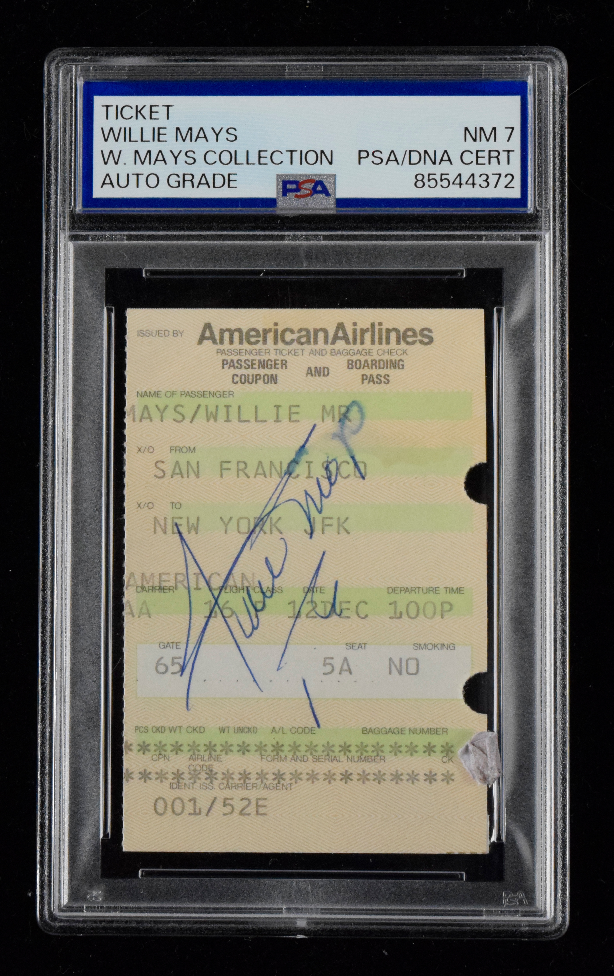 Description:Willie Mays autographed American Airlines boarding pass (PSA/DNA NM 7) Original boarding pass which has his name printed on ("Mays/Willie") for a flight from San Francisco to New York. Signed "Willie Mays" in ink with the autograph graded NM 7. Handling wear and some minor discoloration visible on back. Encapsulated by PSA with "W.Mays Collection" pedigree: PSA/DNA NM 7