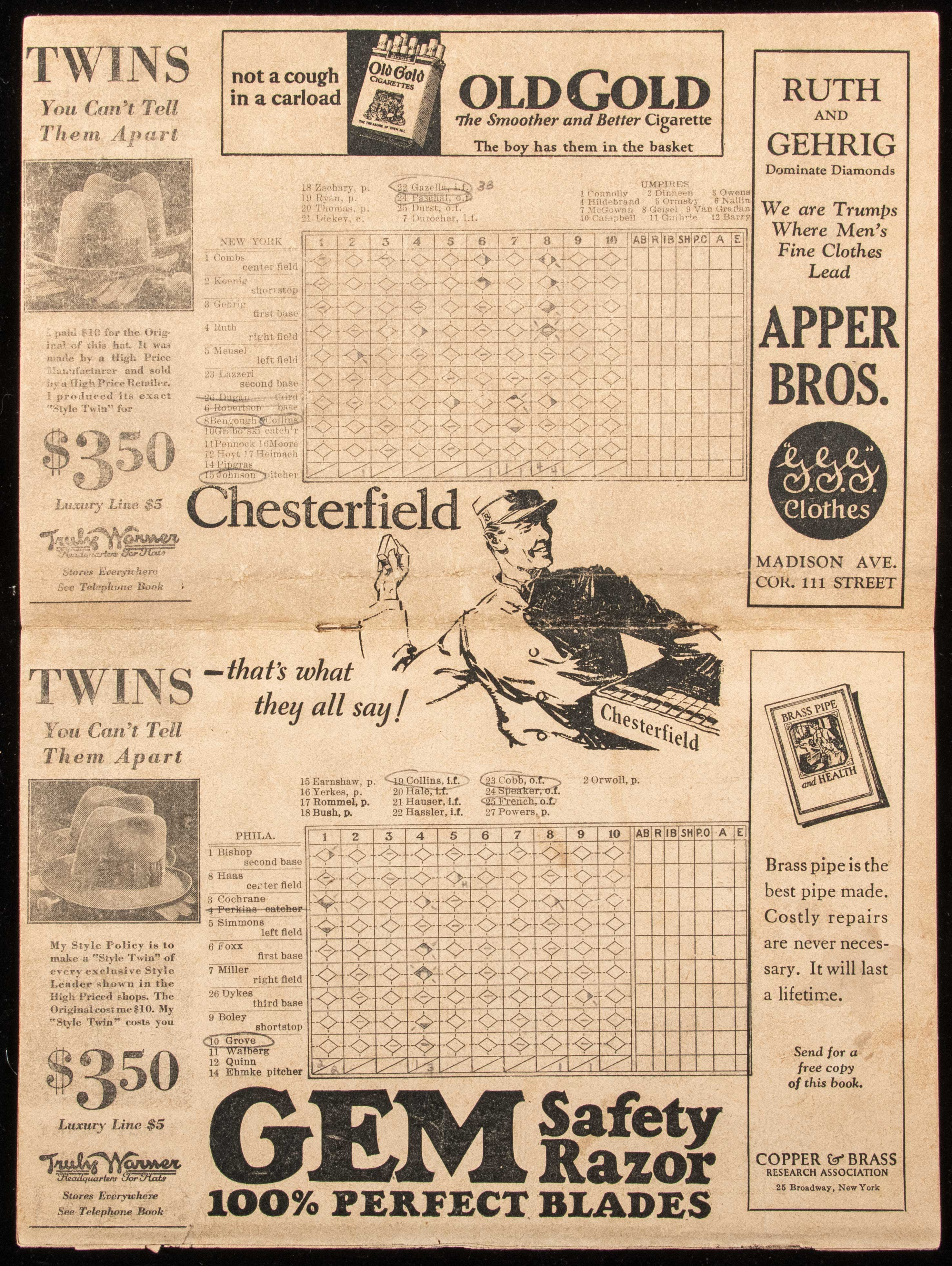 Description:1928 Philadelphia A's at New York Yankees program from Ty Cobb's final career game (GD/VG - Ruth game-winning HR). Yankee Stadium program scored in pencil from the September 11th game in which the Yankees defeated the Athletics by a score of 5-3 on a Babe Ruth game-winning home run off of Lefty Grove in the bottom of the 8th inning. Ty Cobb pinch hit in the 9th inning, popping out to SS, in what would be the final appearance of his career. Mild handling and age related wear throughout, with more pronounced wear to the back pages which have some creases and fraying, along with a few small tears on the back cover: G/VG ($500-$1,000)