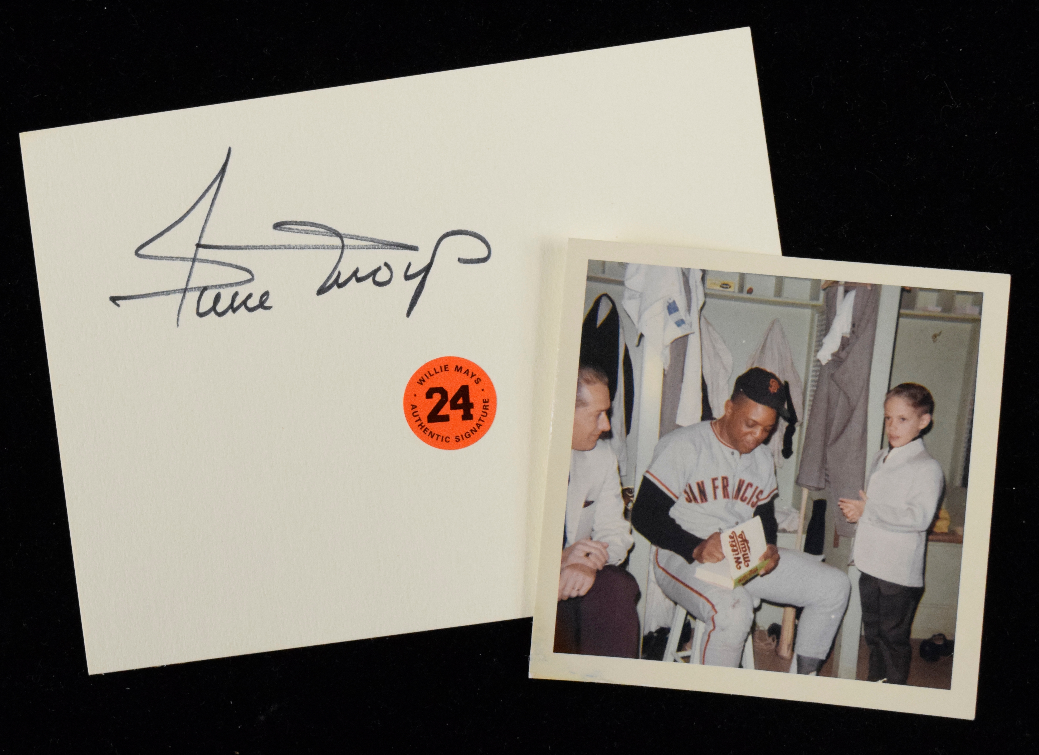 Description:c.1960s Willie Mays snapshot photo with autograph (VG and NM) Color 3.5"x3.5" photo of Mays in uniform, seated in the locker room, signing a copy of his book for a young fan. Kodak stamp on the back with June 1966 date stamp. Light wear with a small corner crease; heavy stock 4.5"x6" card signed "Willie Mays" in marker rating 8 out of 10. "Mays Authentic Signature" sticker affixed. Includes certificate of provenance from the Willie Mays Collection: VG and NM