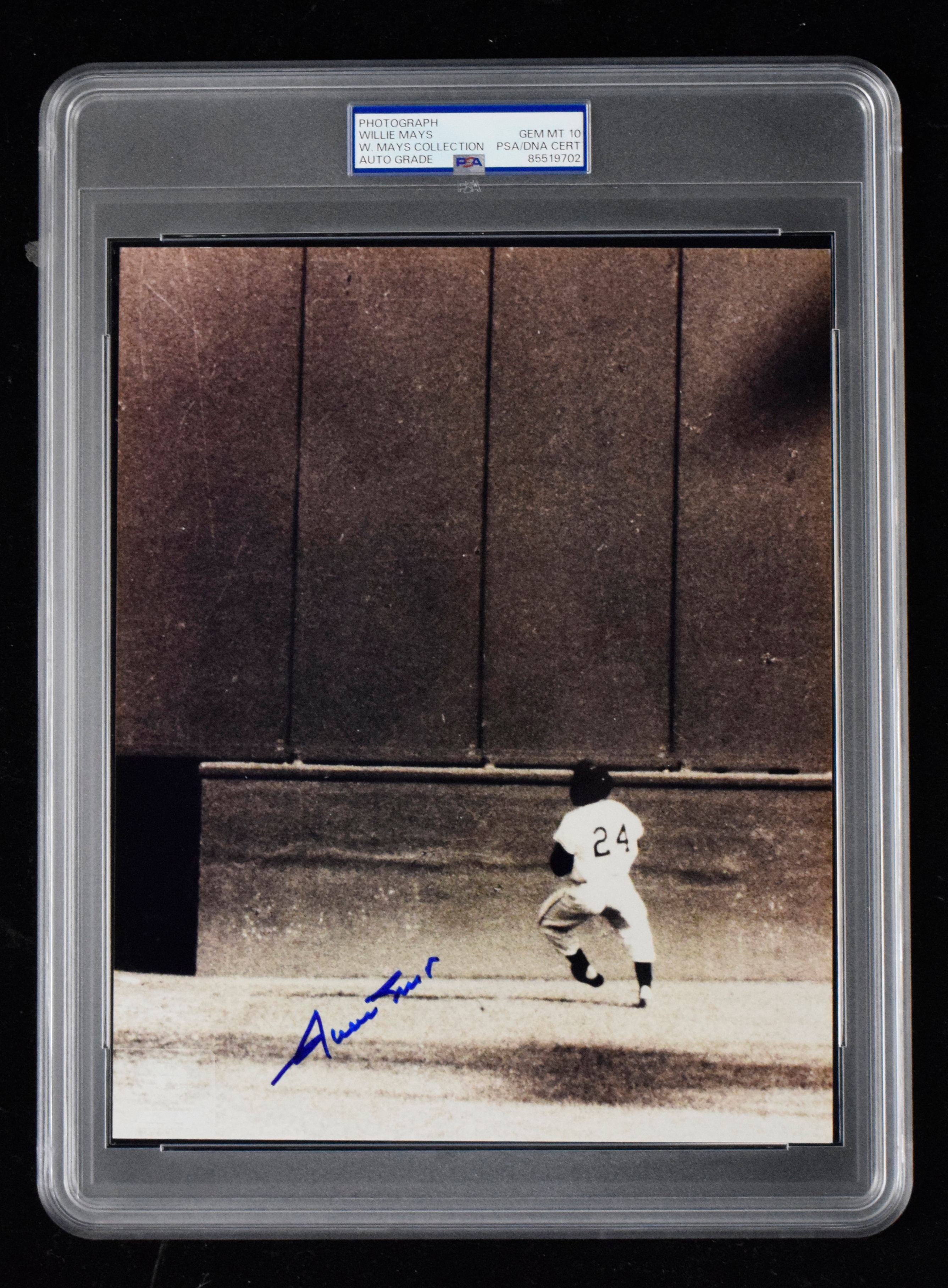 Description: Willie Mays autographed 8"x10" photo of "The Catch" (PSA/DNA Gem Mint 10) Blue marker signature is graded "10" by PSA. Encapsulated with special "W.Mays Collection" pedigree noted on the label: PSA/DNA Gem Mint 10