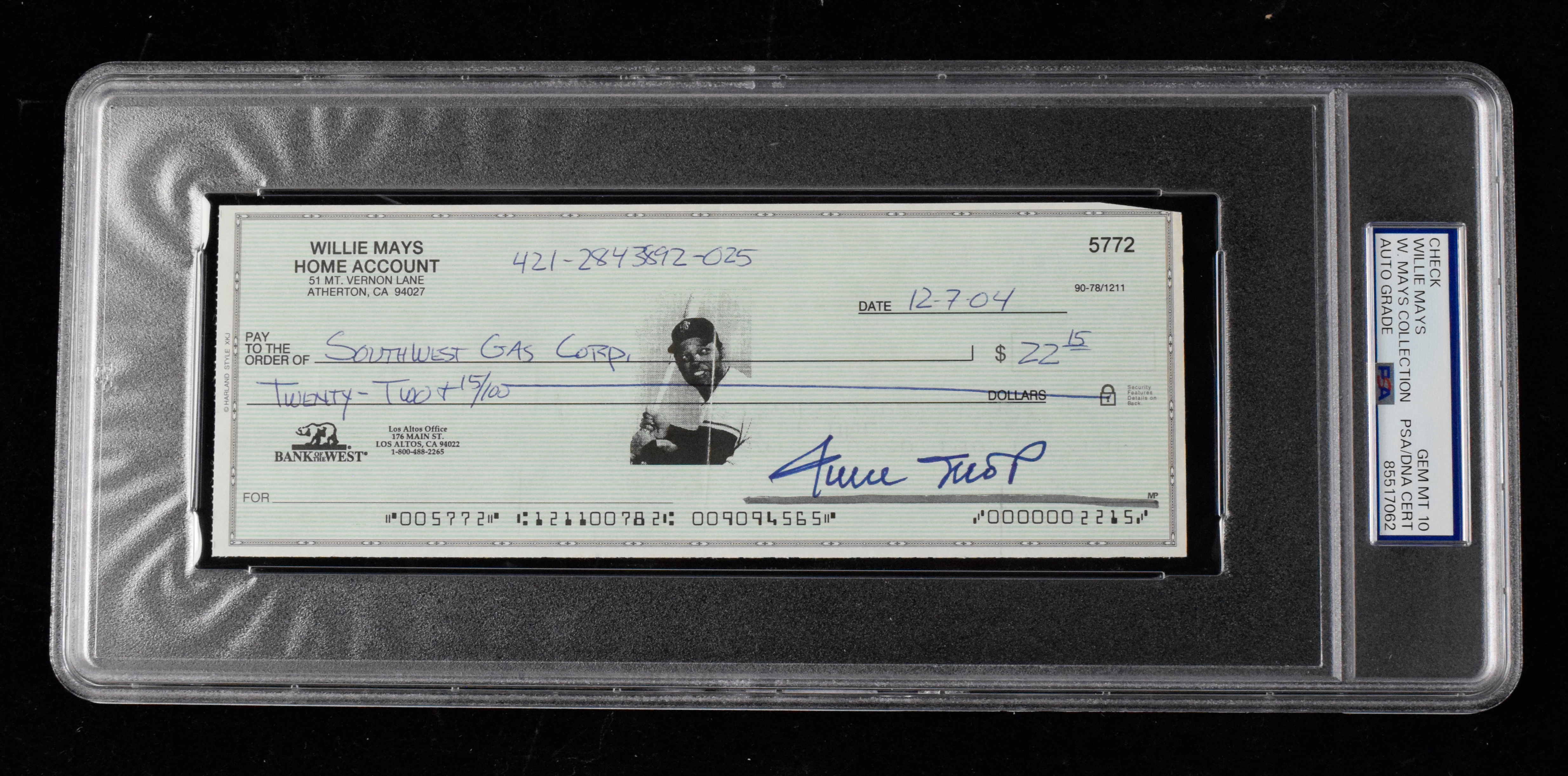 Description:Willie Mays autographed check (PSA/DNA Gem Mint 10) Personal check signed "Willie Mays" at lower right with the autograph graded "Gem Mint 10." Typical bank cancellations and handling wear along with small chip to one upper corner. Encapsulated by PSA with special "W.Mays Collection" pedigree noted on the label: PSA/DNA Gem Mint 10