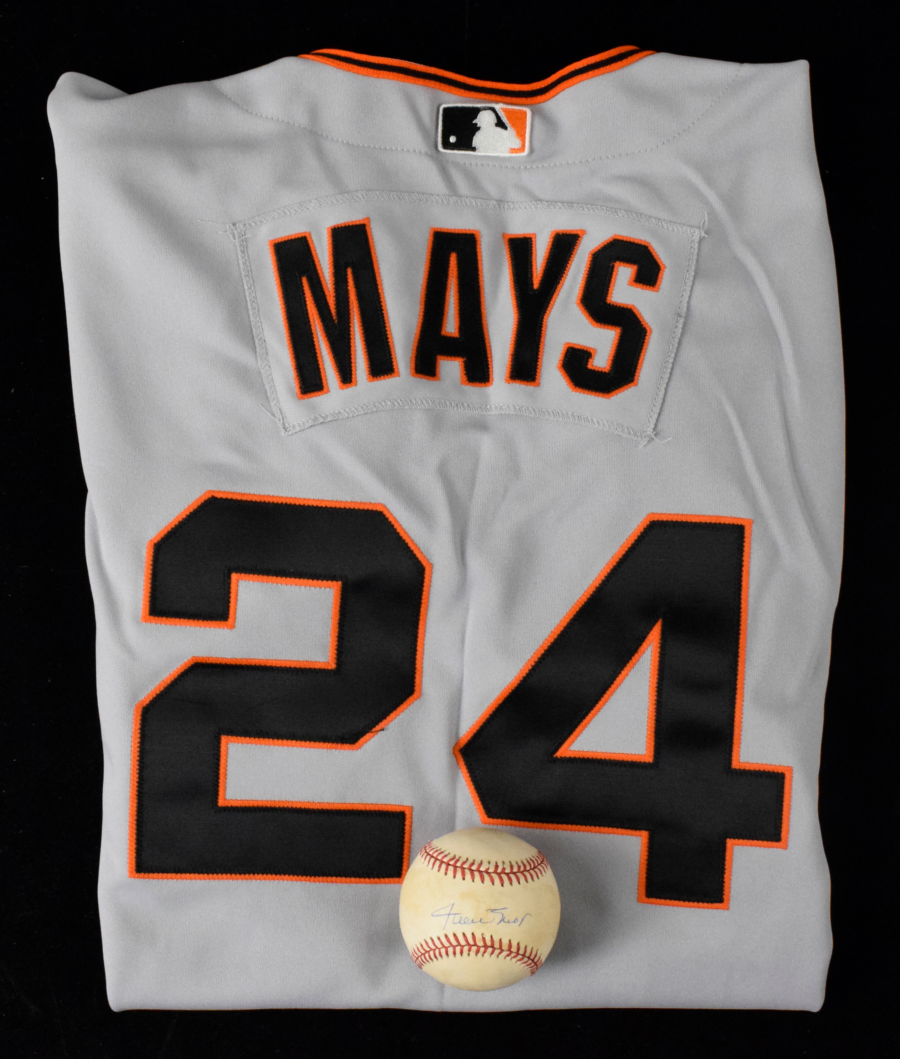 Description:Willie Mays single signed baseball with San Francisco Giants jersey (EX-NM) New, unworn, Giants jersey by Russell Athletic (size 48) with Mays nameplate and number on the back (NM aside from the wrinkles/fold lines); Rawlings L.Coleman ONL baseball (moderate toning) signed in ink rating 8 out of 10. Includes certificate of provenance from the Willie Mays Collection: EX-NM