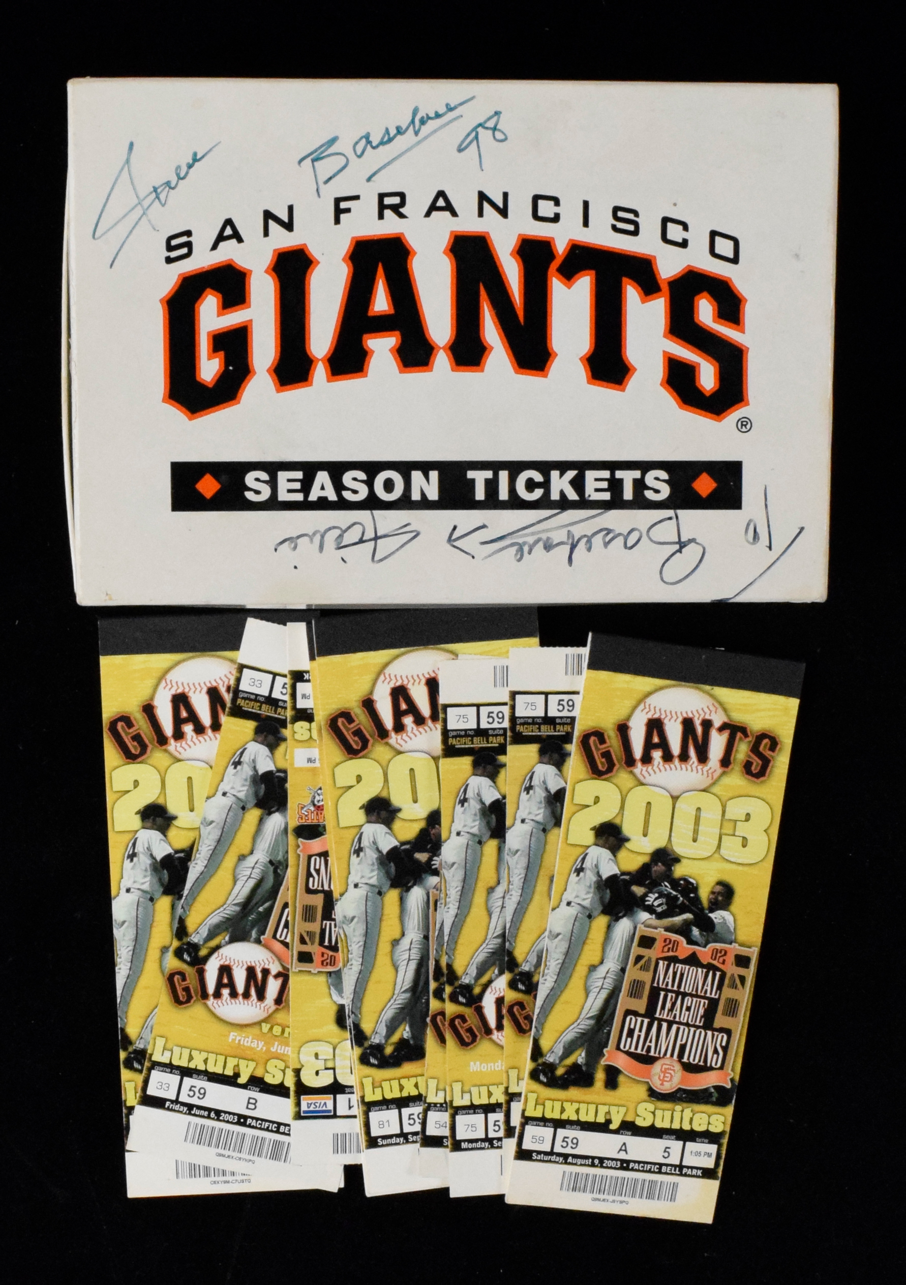 Description:Willie Mays "Willie" signed storage box filled with Giants game tickets (GD-NM) San Francisco Giants team issued box is signed "Willie" twice on the lid in marker (7/8 out of 10) and there are some other handwritten notations. It is filled with booklets of tickets (some complete, some missing a few tickets) issued for Mays' personal suite issued in either 2003 or 2004. Includes booklets (varying quantities) issued for approx. (9) games played in 2003 and (16) games played in 2004. In addition, there are some loose tickets (mostly lower premium box, portion related to the suite) including a good number from games played in July of 2003. Varying degrees/types of wear througout. Includes certificate of provenance from the Willie Mays Collection: GD-NM
