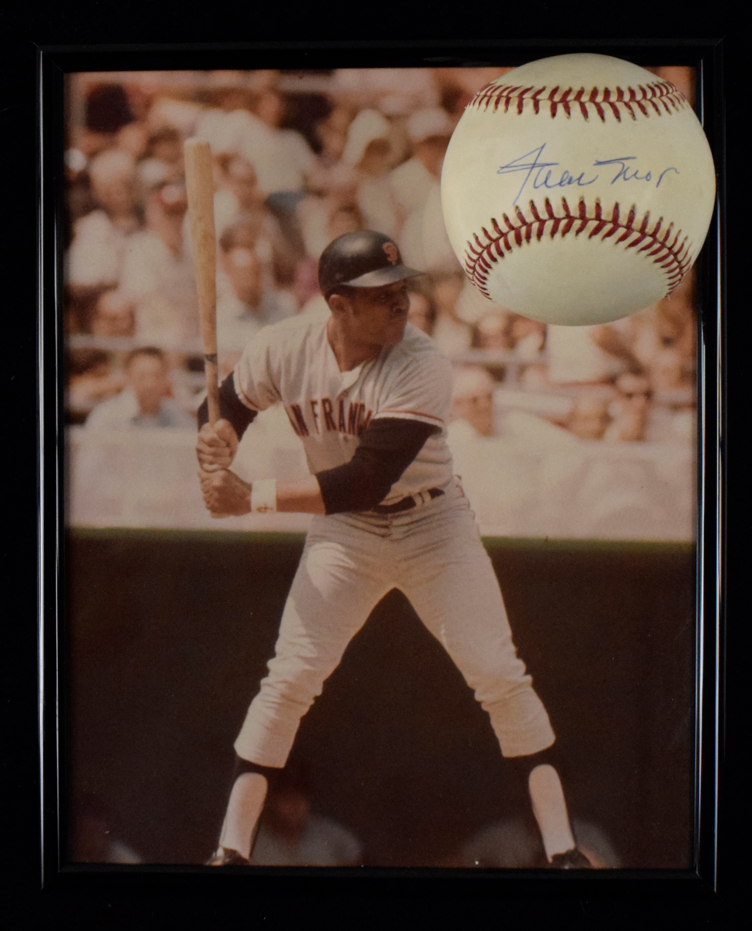 Description:Willie Mays signed baseball with batting photo (EX-NM) Color photo is framed (8.25"x10.25") as displayed within the Mays home/office. Hint of wear to frame. Image is a modern print, likely done within the last 20 to 30 years; Rawlings L.Coleman ONL baseball signed in ink rating 8 out of 10. Moderate toning. Includes certificate of provenance from the Willie Mays Collection and the ball has a "Mays Authentic Signature" label affixed: EX-NM