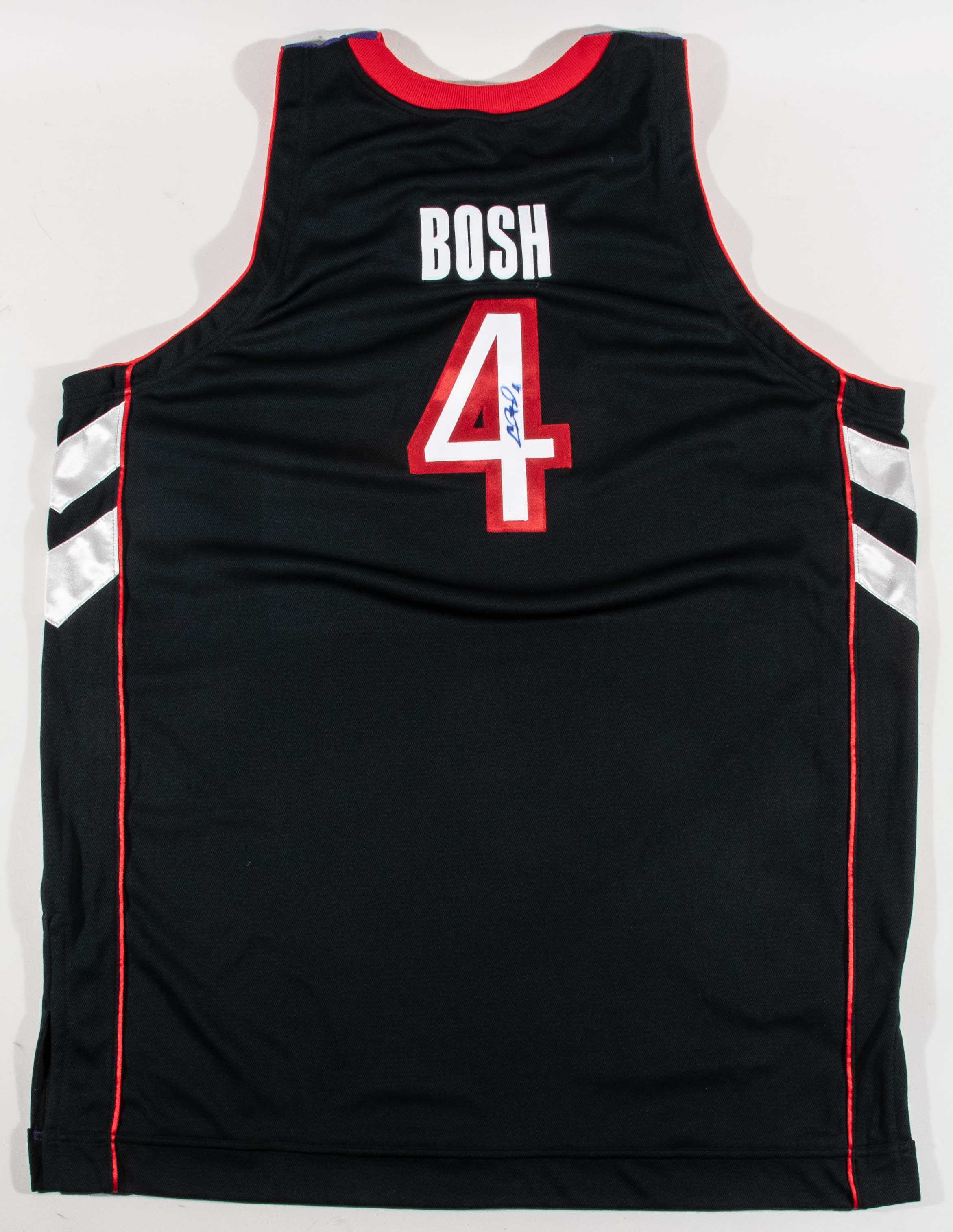 Description:Chris Bosh autographed 2004-05 Toronto Raptors professional model jersey - JSA (EX). Black, red, and purple jersey has "RAPTORS" team name lettered across the front with #4 below, along with "BOSH" and #4 sewn on the back. Reebok tag on the front tail has adjacent size (56), year (2004-2005), and custom length (+6) flag tags. Bosh sighned the jersey in blue marker. Signature rates 7 out of 10 due to some ink bleeding. Light evident use and/or wash wear. MEARS serial #301706 sticker is on the jersey. Includes a previous auction LOA from JSA, and LOA from Hunt Auctions: EX ($400-$600)