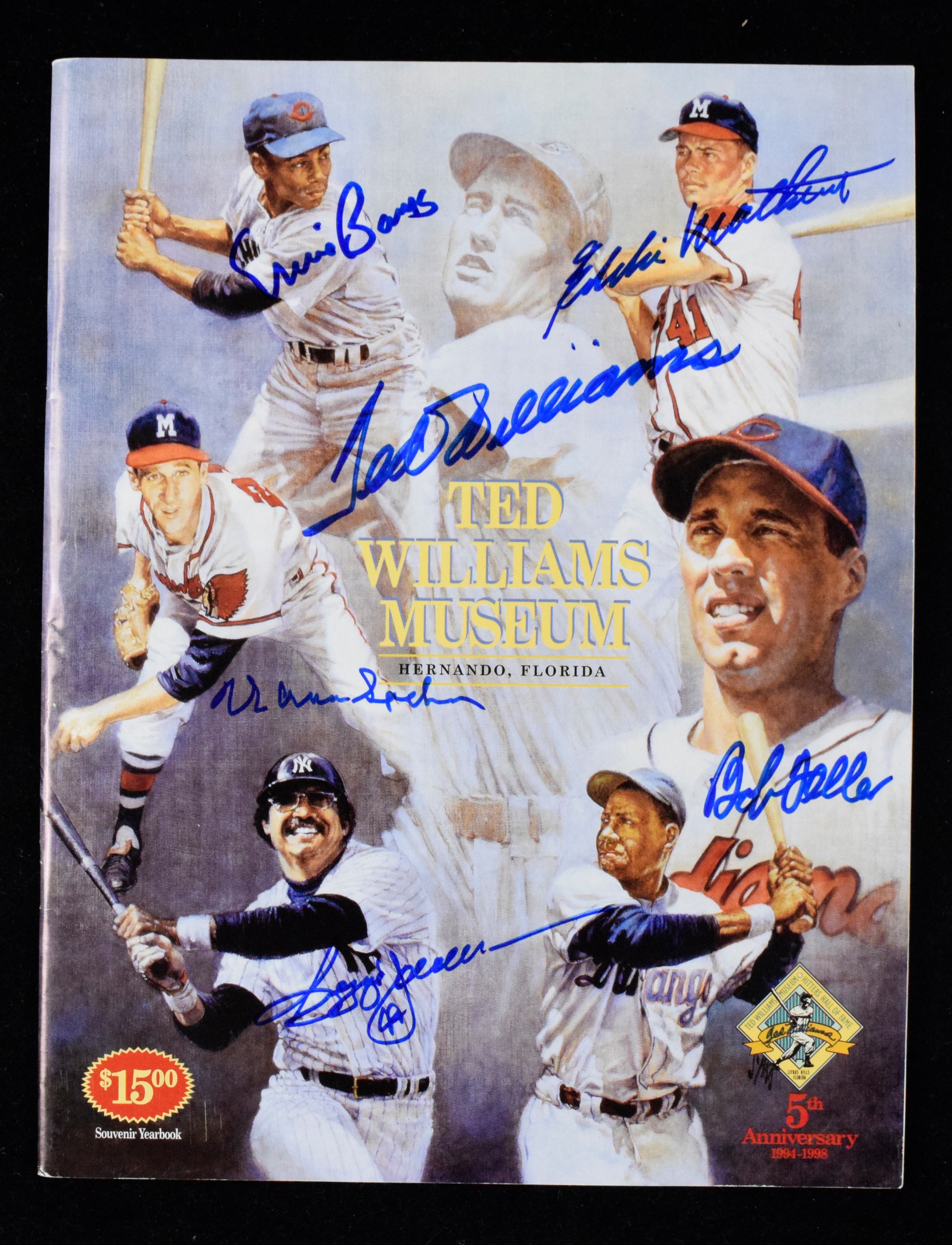 Description:Ted Williams and others autographed 1998 Williams Museum program (Sigs. NM) Signed on the cover (in marker rating 9-9/10 out of 10) by Williams, Ernie Banks, Reggie Jackson, Warren Spahn, Eddie Mathews, and Bob Feller. Light wear: Sigs. NM