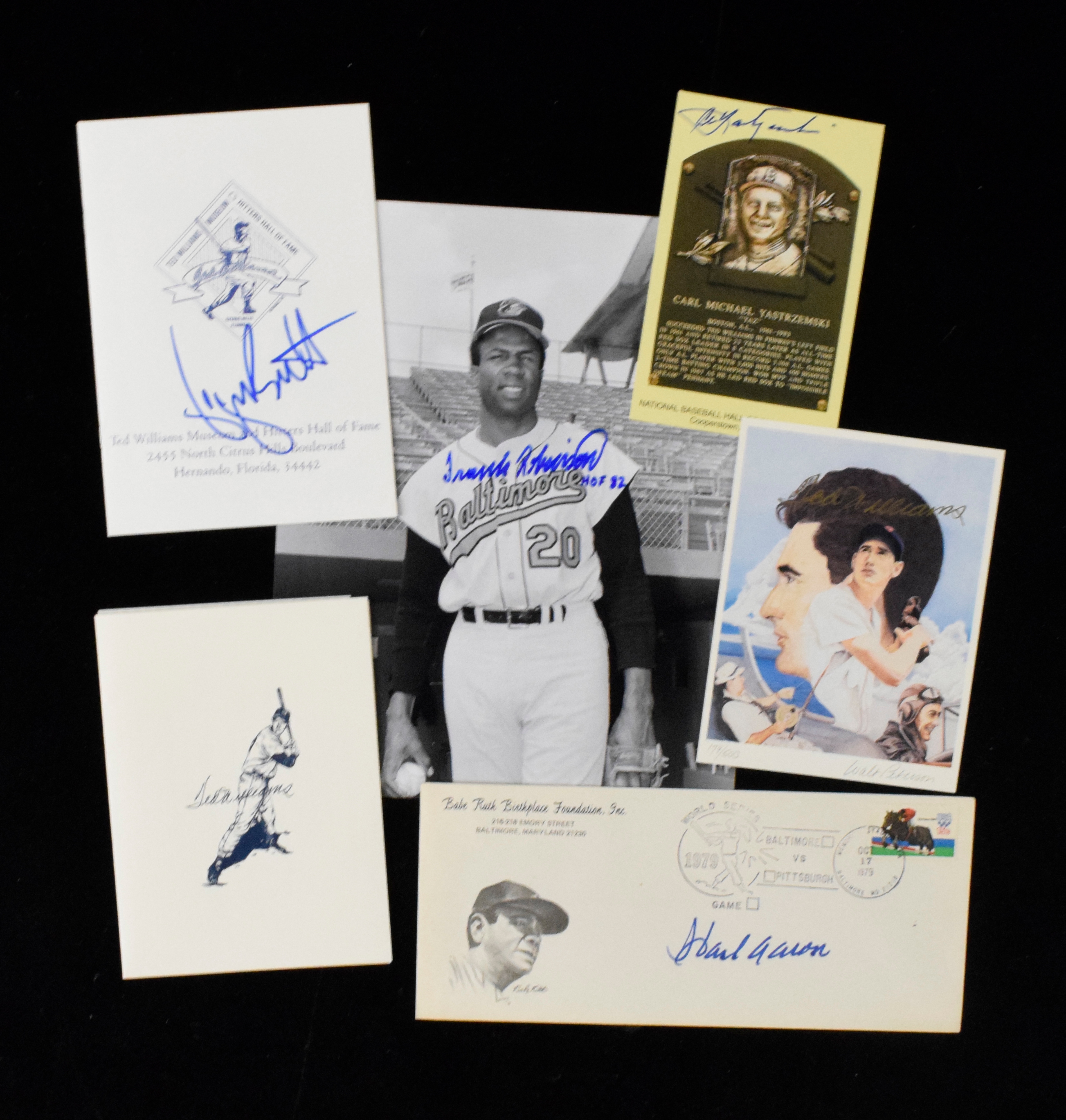 Description:Lot of (5) Hall of Famer autographs including Hank Aaron and Ted Williams (Sigs. NM) Includes Ted Williams signed 4.5"x6" limited edition print (issued as part of Hitters Hall of Fame opening packet, balance of which is included); Hank Aaron signed Babe Ruth Birthplace postal cover; George Bretty signed Hitters Hall of Fame program from 2000 induction; Carl Yastrzemski signed yellow Hall of Fame postcard; and Frank Robinson HOF inscribed signed 8"x10" photo. Signatures rate 8 out of 10 or better: Sigs. NM