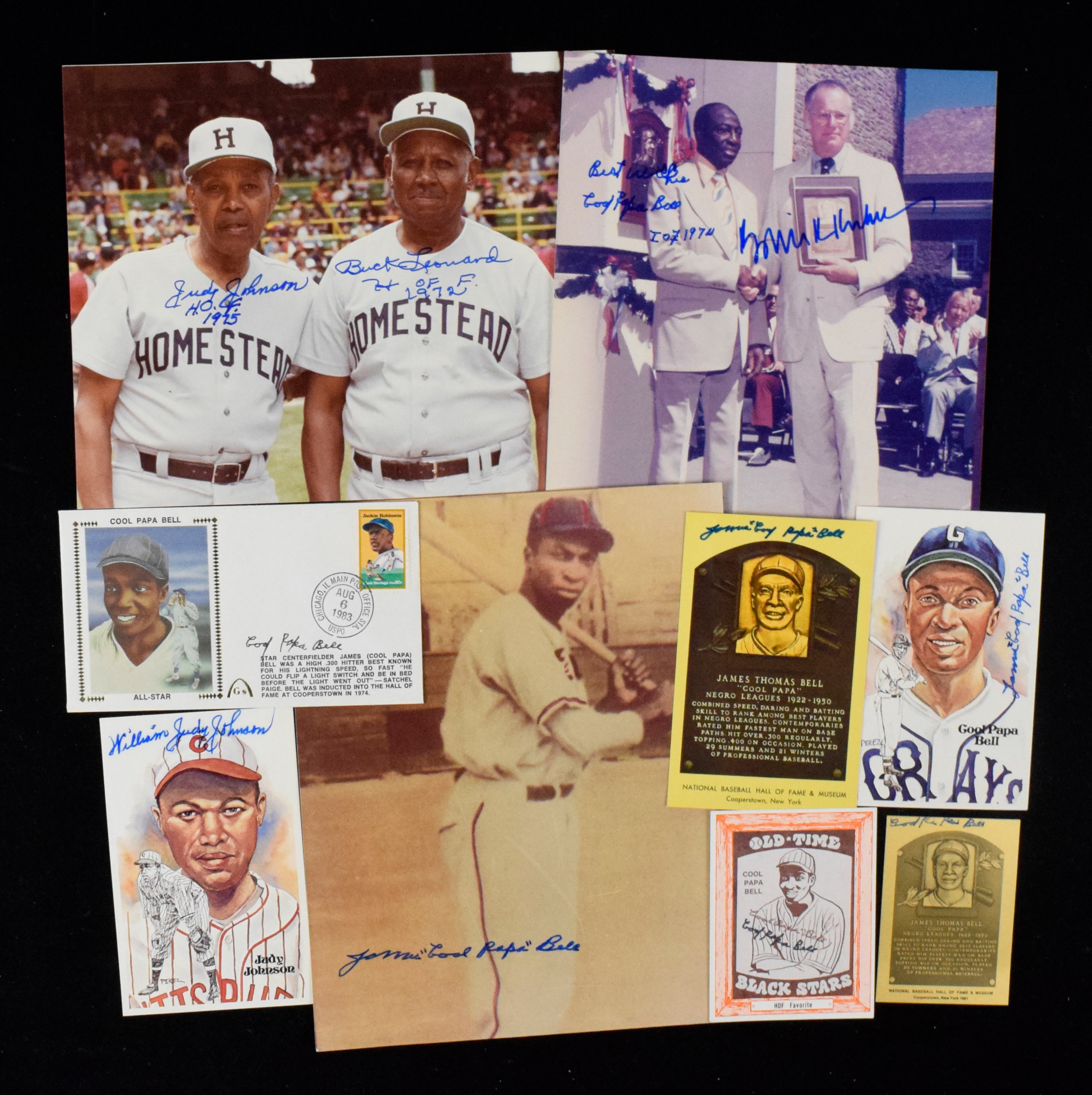 Description:Negro League Hall of Famers autograph lot (10 pieces) (EX-NM) Includes 8"x10" color photo signed by Judy Johnson and Buck Leonard who have both added HOF inscriptions; Judy Johnson and Cool Papa Bell signed Perez-Steele postcards; Cool Papa Bell signed 1976 Douglas and Bell card, yellow Hall of Fame postcard, metallic Hall of Fame card, 8"x10" photo, "Congressional Record" paper, and commemorative postal cover; and 8"x10" photo signed by Bell and Bowie Kuhn. Signatures rate 7 to 9 out of 10: EX-NM