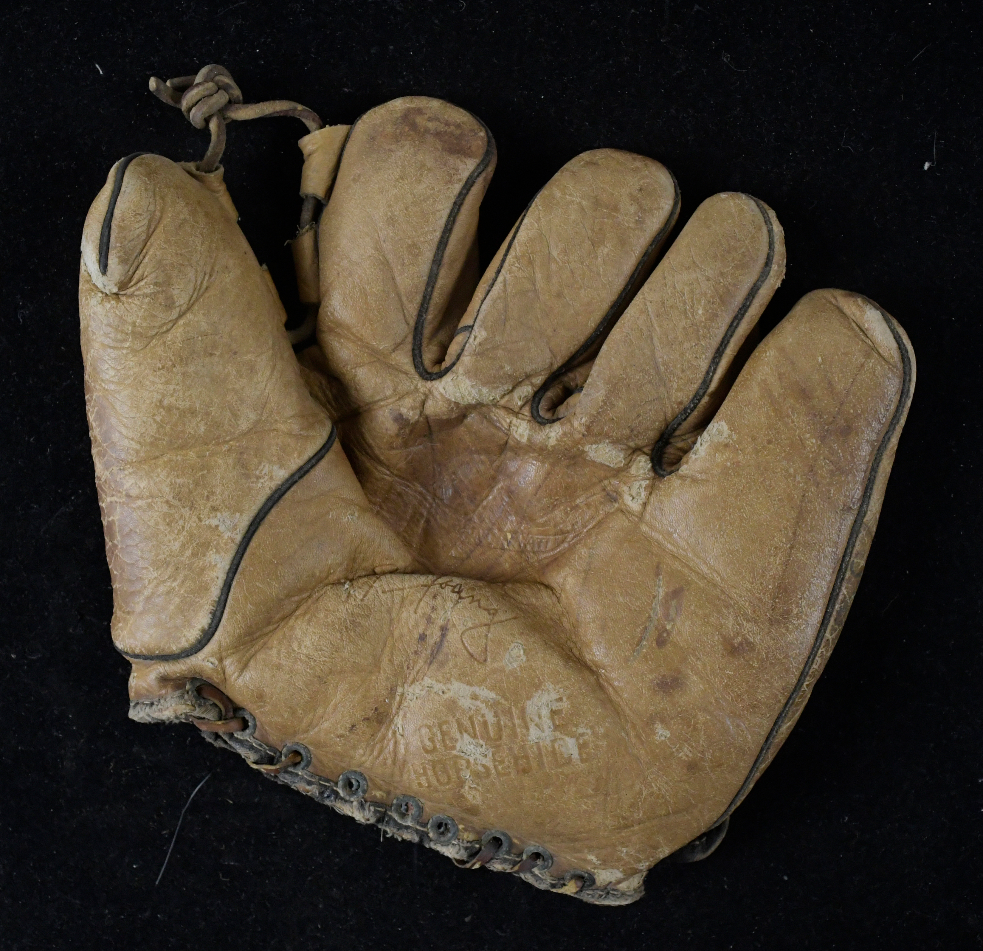 Description:Cy Young vintage store model baseball glove, c.1920s-30s (VG). Hutch model 36 glove for right handed thrower with Young's facsimile signature stamped in the palm. Used, with heaviest wear being loss to the inner palm padding, but stampings remain visible: VG ($300-$500)