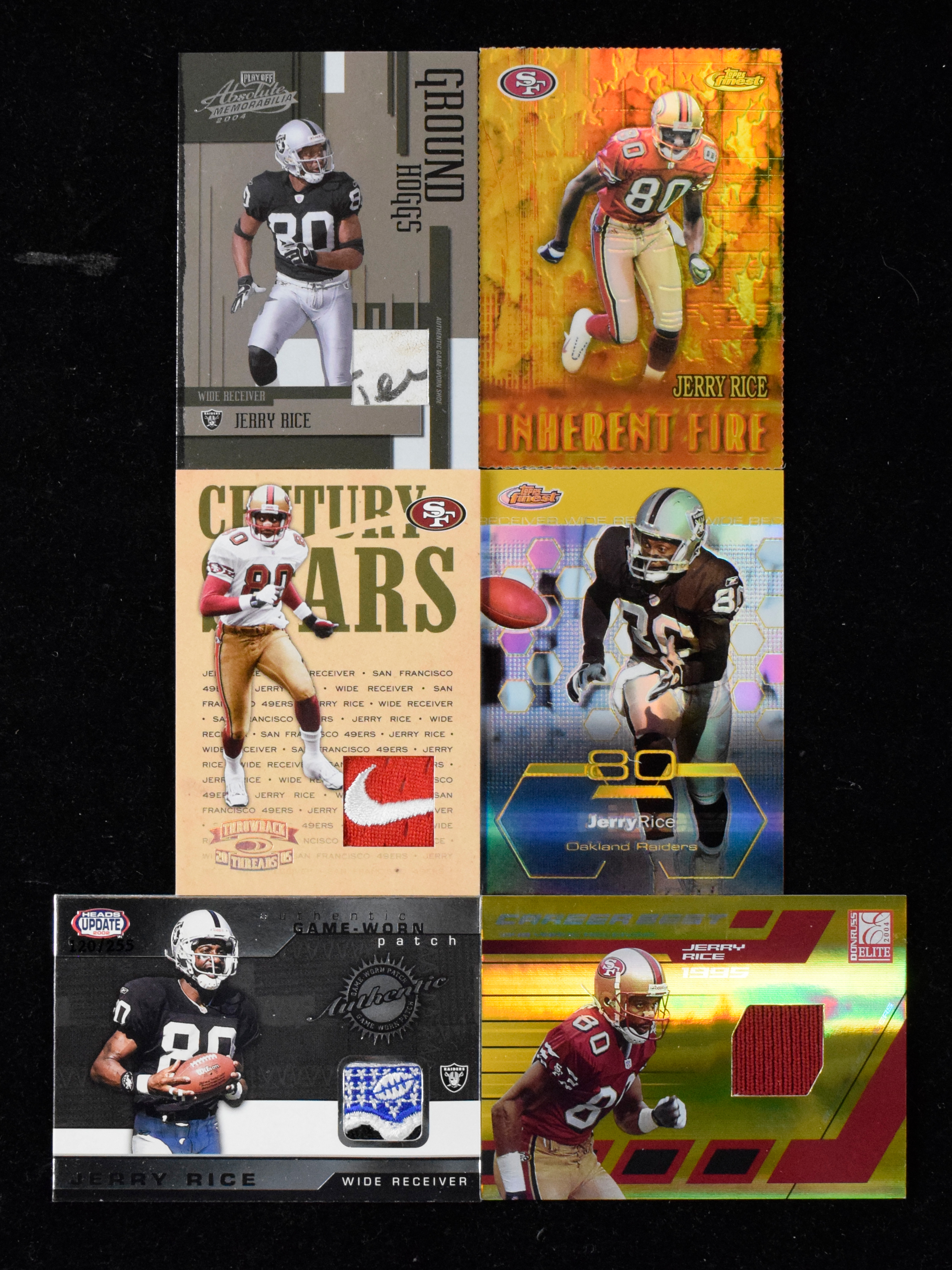 Description:Nice lot of (8) 1999-2005 Jerry Rice insert cards (EX-NM, See description) 1999 Collector's Edge Fury game ball patch; 2000 Topps Finest Inherent Fire Jerry Rice and Plaxico Burress (97/100); 2002 Pacific Heads Update patch card (NOTE - it is possible that the patch was switched on this card); 2003 Leaf Limited Silver Spotlight (71/75); 2003 Topps Finest Gold Refractor (17/50); 2004 Playoff Absolute Memorabilia Ground Hoggs shoe patch (98/125); 2005 Donruss Elite Career Best patch (19/25); 2005 Donruss Throwback Threads Century Stars patch (4/25 - Nike Swoosh patch which may have been swapped). Touch of light wear to a few pieces: EX-NM