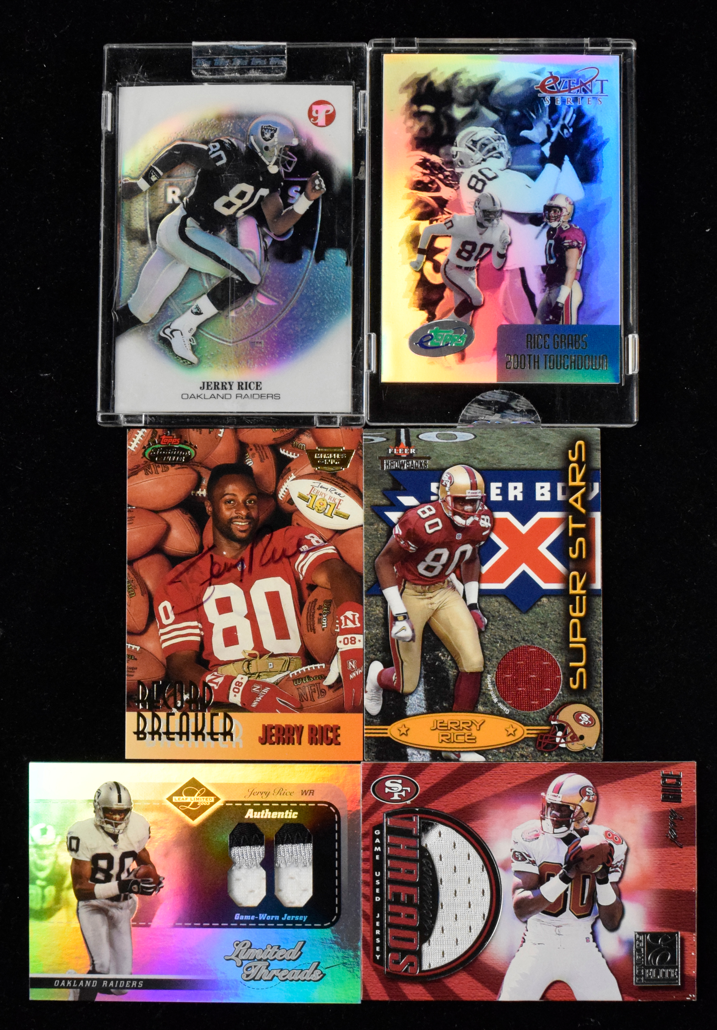 Description:Lot of (15) Jerry Rice cards including patch, numbered, and (1) autographed (EX-NM) Includes 1993 Topps Stadium Club Members Only Record Breaker auto (signature slightly faded, approx. 7 out of 10); 1999 Donruss Elite Common Threads Rice and Steve Young patch (65/150); 2000 Fleer Feel The Game patch (2001 UD Graded patch (75/125); 2002 Topps Pristine #41 Rice Refractor (19/349 - sealed in original case); 2002 eTopps Event Series Rice Grabs 200th Touchdown (sealed in original case); 2002 Fleer Throwbacks Super Stars patch; 2002 Fleer Box Score All Pro Roster patch of Rice, Randy Moss, Cris Carter, and Tim Brown; 2003 Leaf Limited Limited Threads patch (8/80); 2003 Leaf Limited Player Threads patch (29/50); 2004 SPx Winning Materials Rice and Randy Moss patch; and a few others. Touch of light wear to a few pieces: EX-NM