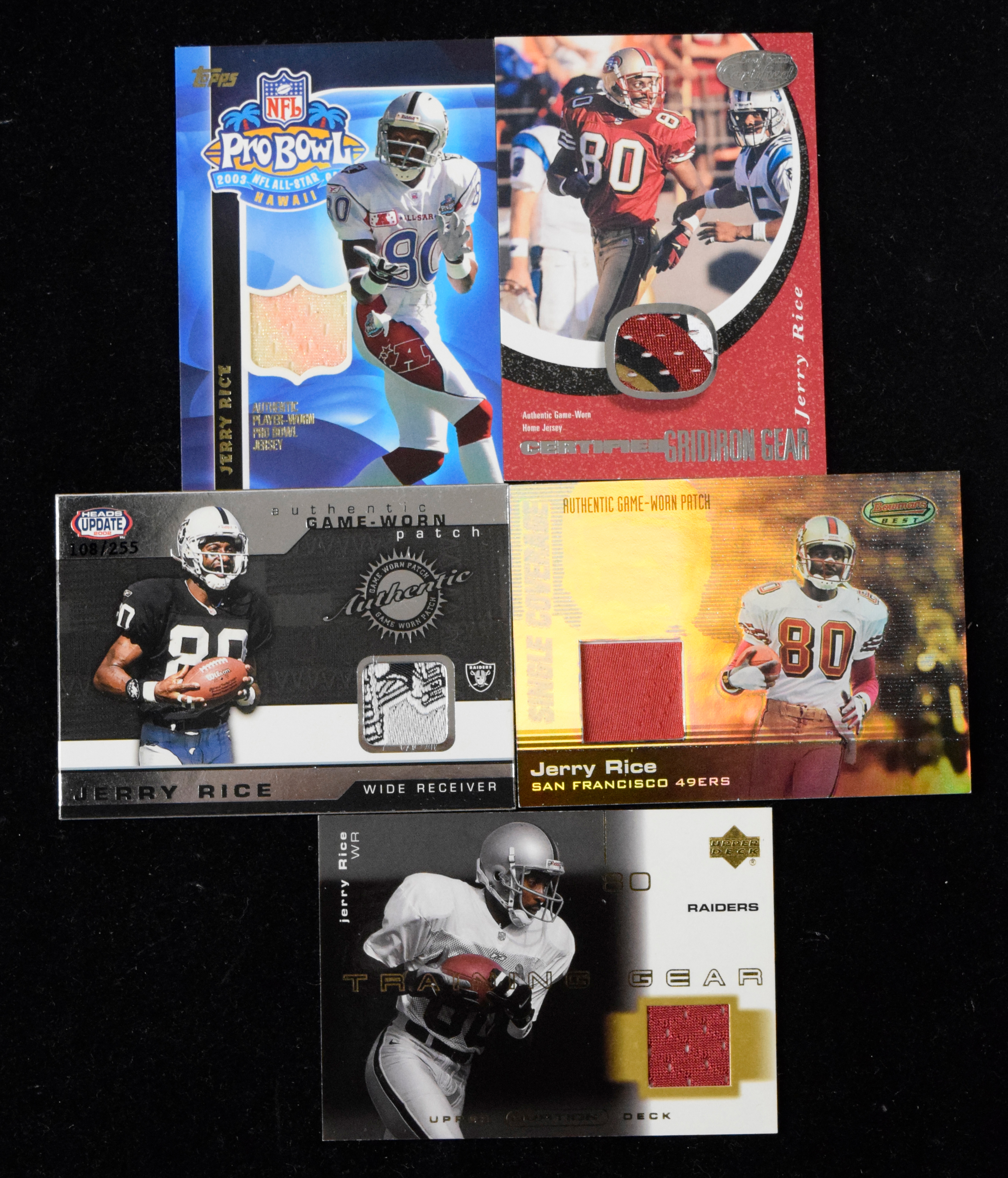 Description:Lot of (12) Jerry Rice patch insert cards (EX-NM) Includes 2000 Leaf Certificate Gridiron Gear (207/300 - multi color patch); 2000 Leaf Rookie & Stars Great American Treasures patch (71/100); 2001 UD Vintage Vintage Threads; 2002 UD Graded patch (17/50); 2002 Fleer Throwback On 2 Canton Rice and Randy Moss jersey patch (47/50); 2002 Pacific Heads Update patch (108/255 - possibly that patch was changed); 2003 Topps Pro Bowl jersey patch; 2003 Bowman's Best Single Coverage patch (46/100); and others. Touch of light wear to a few pieces: EX-NM