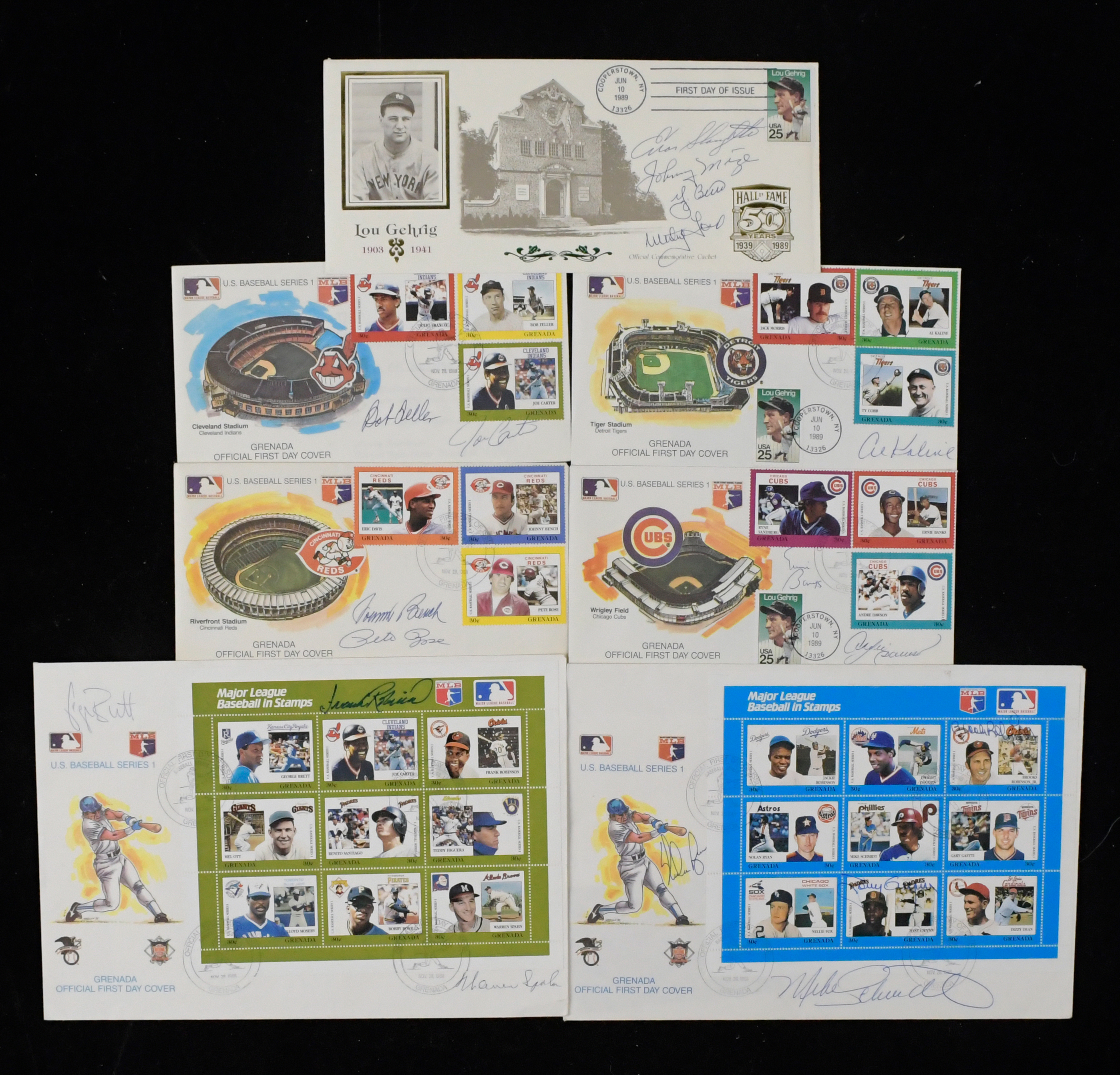 Description:Lot of (7) autographed First Day Covers with (18) sigs. Including Hall of Famers (EX-NM) Includes oversized Grenada First Day covers which have full stamp sheets affixed. One is signed by Tony Gwynn, Mike Schmidt, Nolan Ryan, and Brooks Robinson. Another signed by George Brett, Frank Robinson, and Warren Spahn; Lou Gehrig First Day cover signed by Enos Slaughter, Johnny Mize, Yogi Berra, and Whitey Ford; Riverfront Stadium cover signed by Pete Rose and Johnny Bench; Wrigley Field cover signed by Ernie Banks and Andre Dawson; Cleveland Stadium cover signed by Bob Feller and Joe Carter; Tiger Stadium cover signed by Al Kaline. Signatures rate 7 to 9/10 out of 10. Light scattered wear: EX-NM